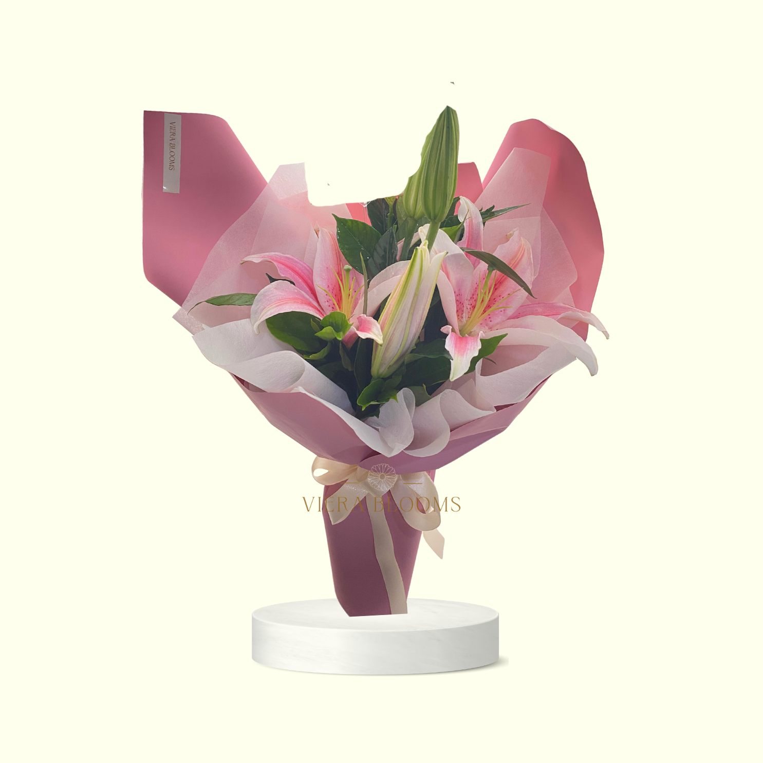 A beautiful arrangement of Stargazer lilies (per stem 2-3 heads) paired with fresh eucalyptus leaves, offering a fragrant and vibrant display that lasts 2-3 days.