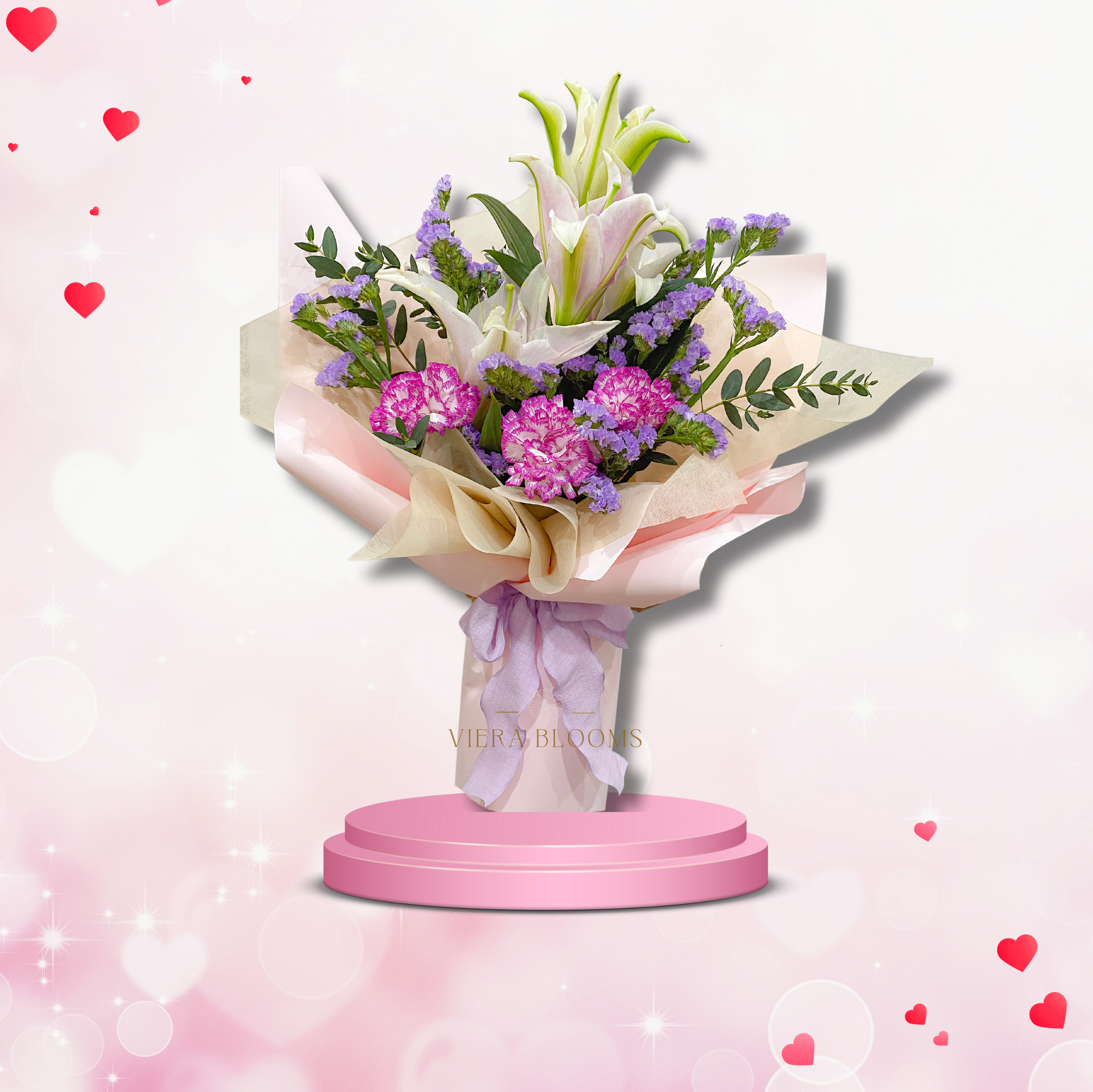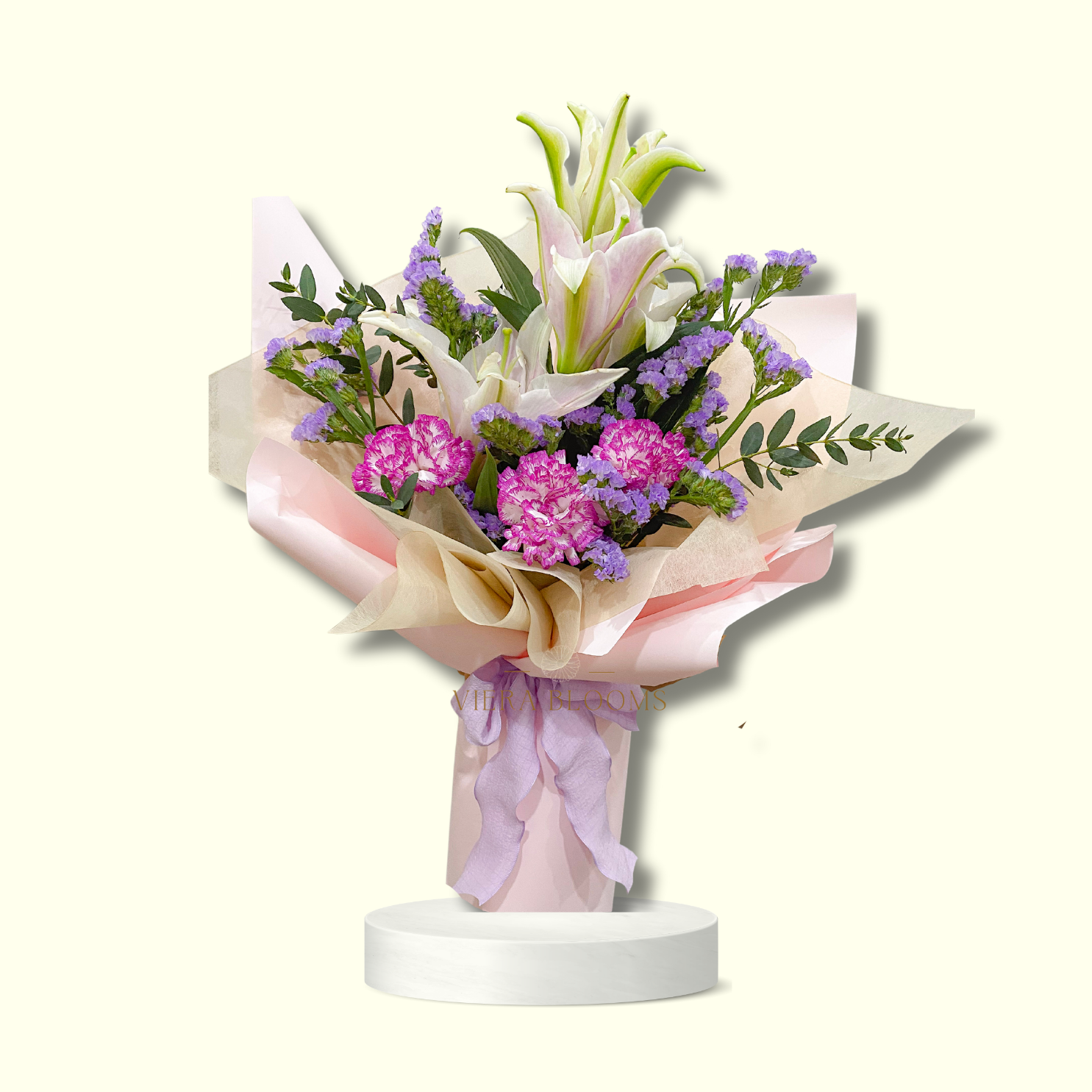 Single Stargazer with 3 pcs two-toned purple carnation with parvifolia leaves. Fresh Blooms that can last up to 3-4 days.