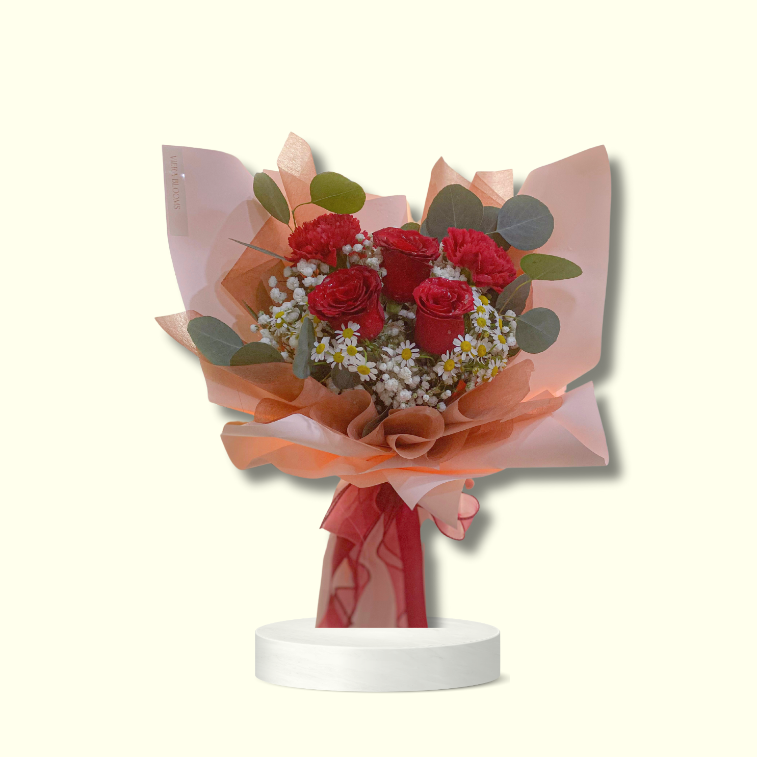 3 pcs Imported Red Roses, 2 pcs Red carnations with Parvifolia leaves. Fresh Blooms that can last upto 3-4 days with minimal proper care.