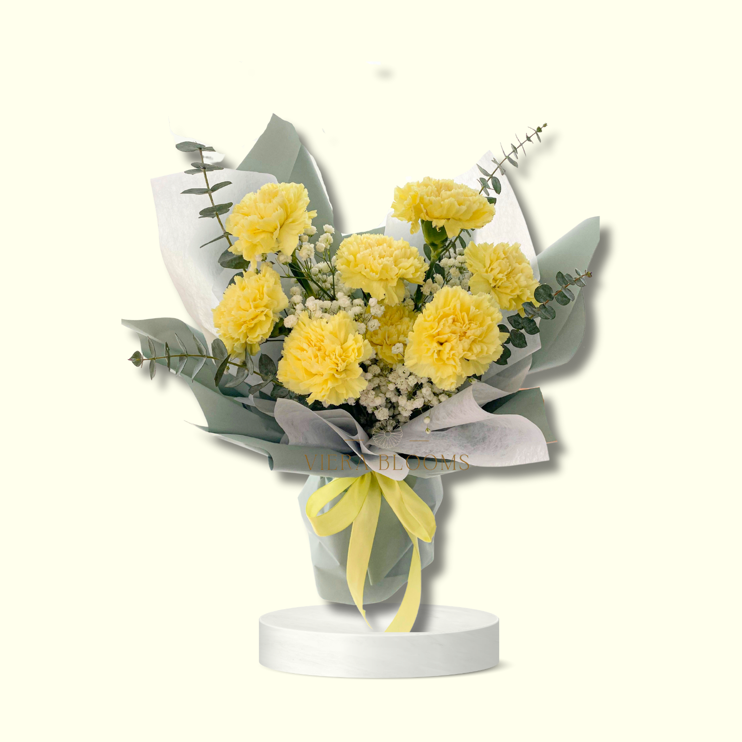 8 pcs. Yellow Carnation, white fresh Gypso with Eucalyptus Leaves. Fresh Blooms that can last up to 3-4 days with minimal proper care.