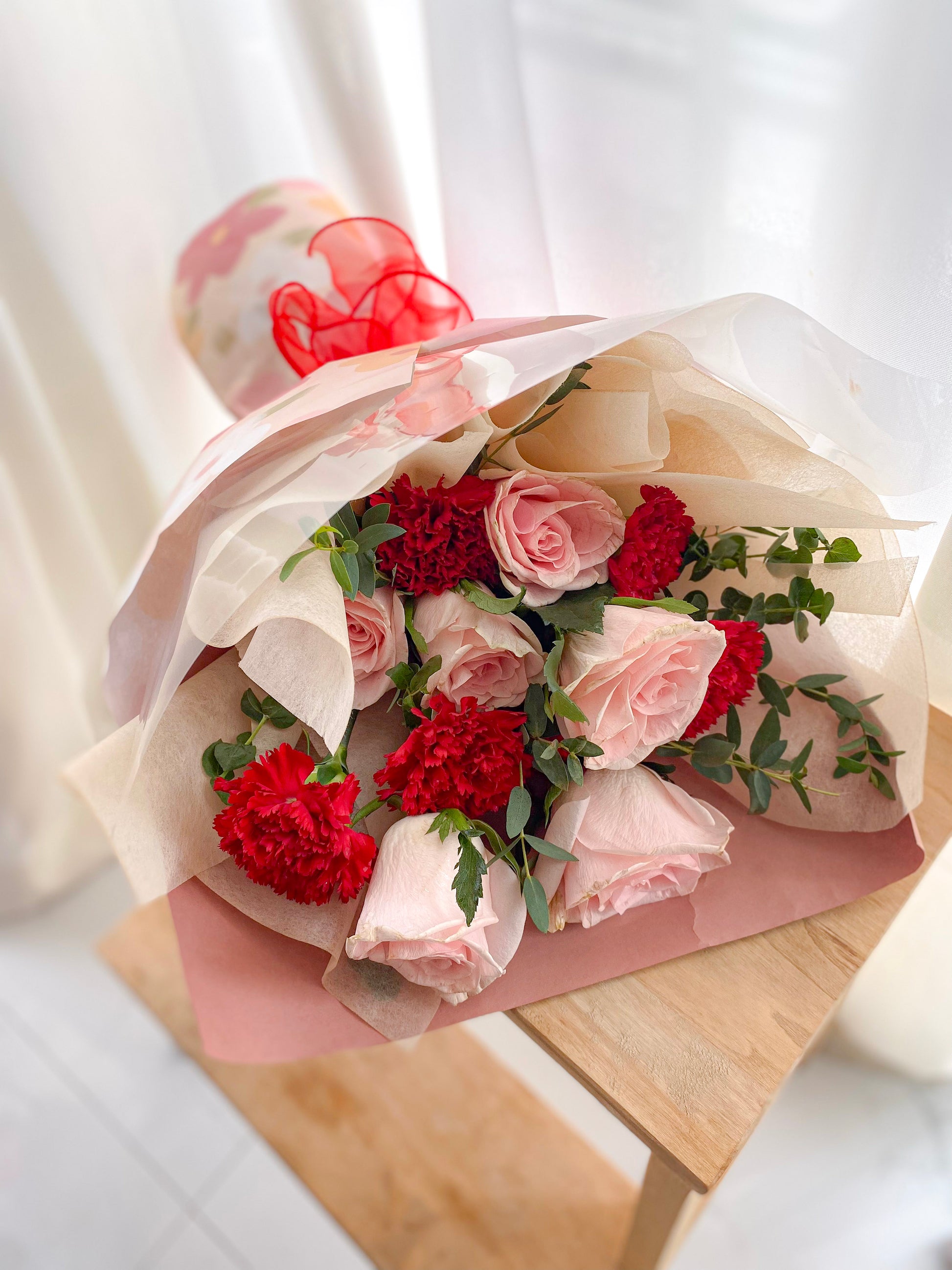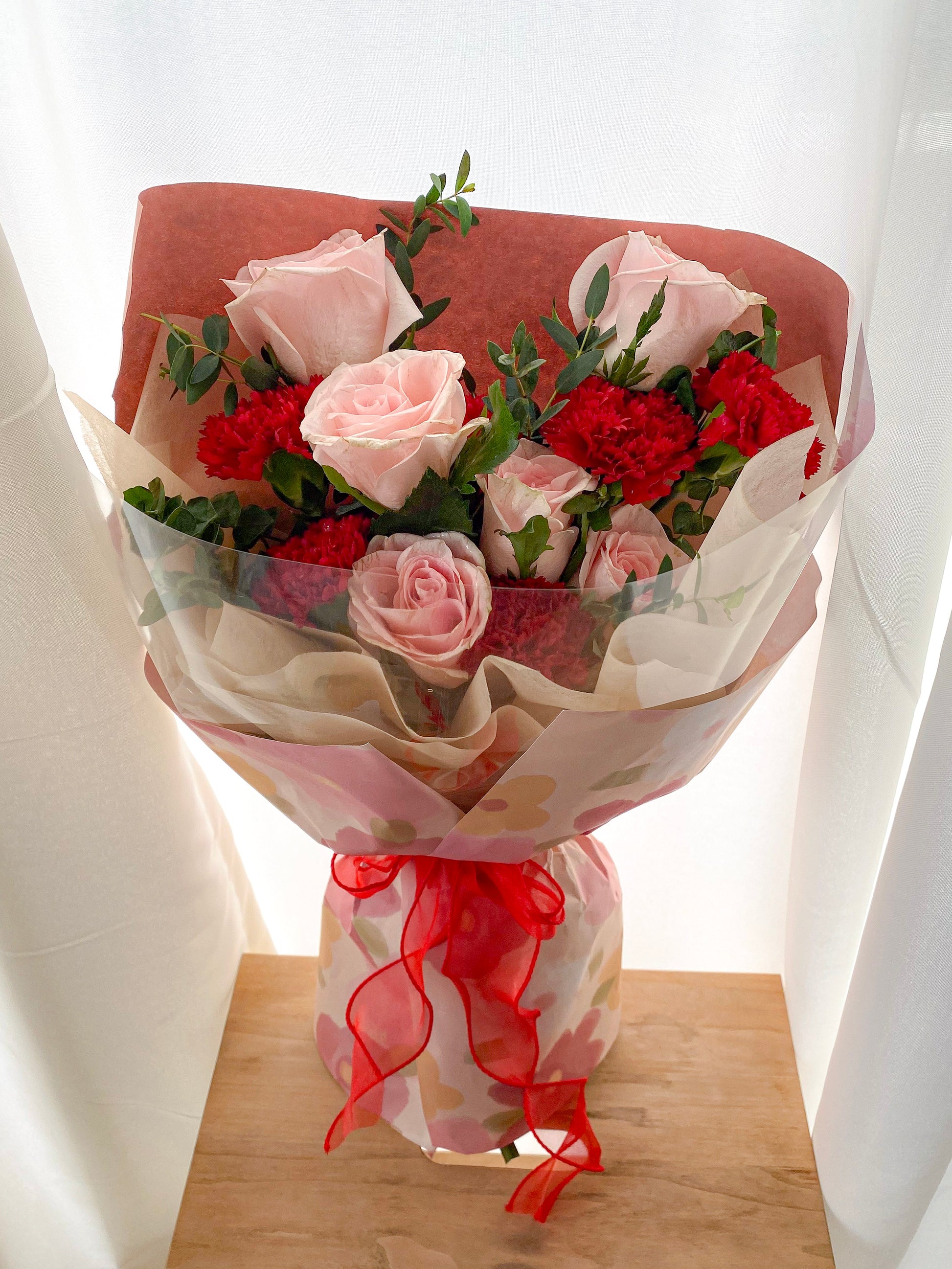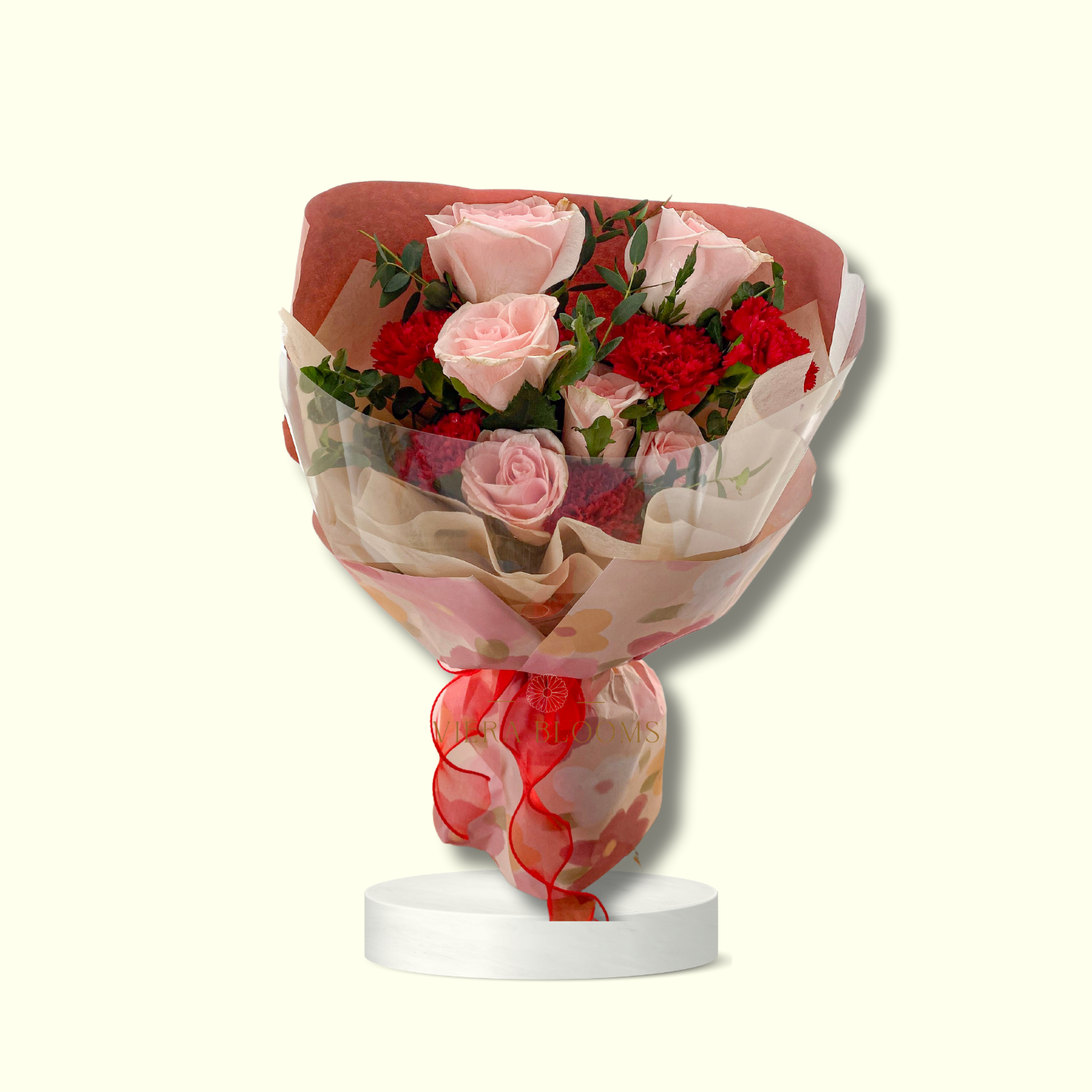 6 pcs Imported Pink Roses, 6 pcs Red carnations with Parvifolia leaves. Fresh Blooms that can last upto 3-4 days with minimal proper care.