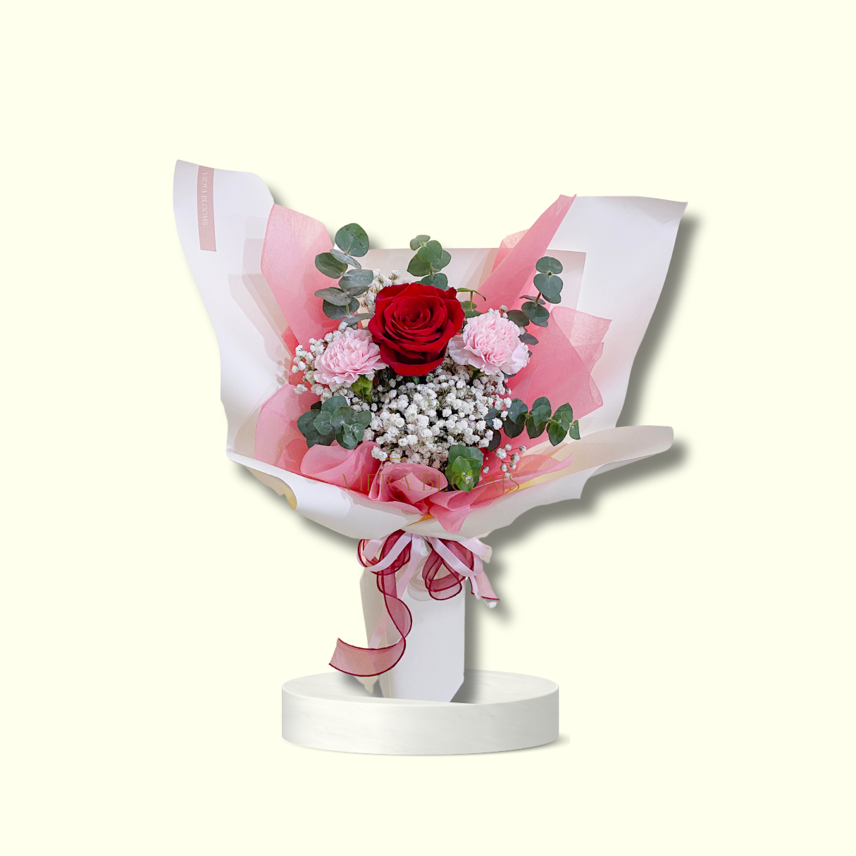 Single Red Ecuadorian Rose, 2 pcs. Pink Carnations, with Gypso and Eucalyptus Leaves. Fresh Blooms that can last up to 3-4 days with minimal proper care.