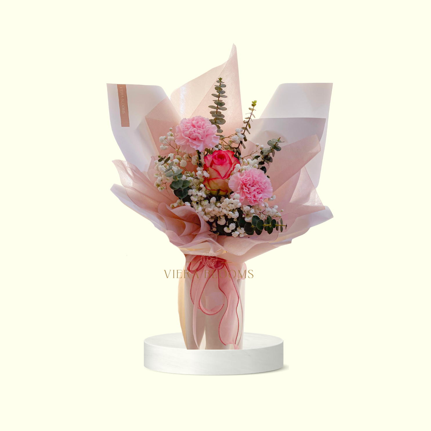 Single Imported Two- toned Rose and 2 Pink carnations with Gypso with Eucalyptus Leaves. Fresh Blooms that can last upto 3-4 days with minimal proper care.