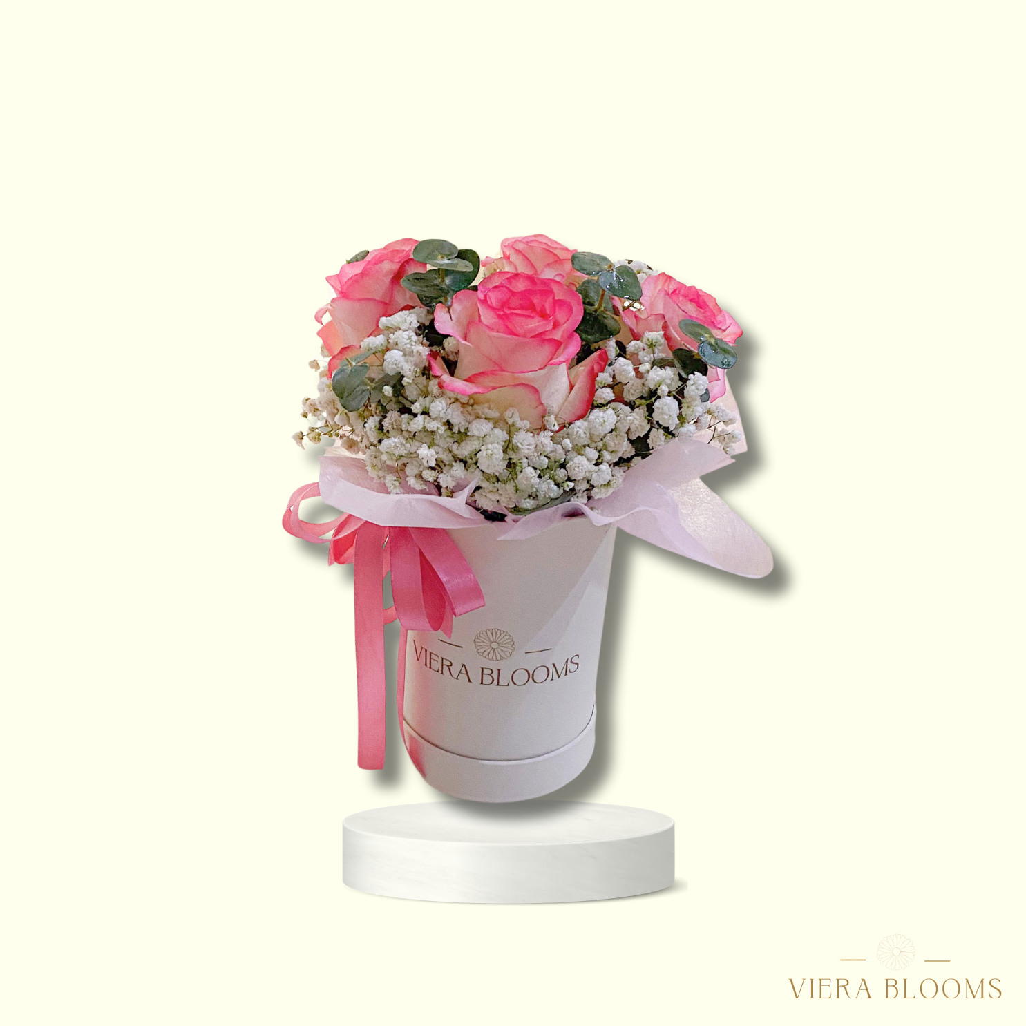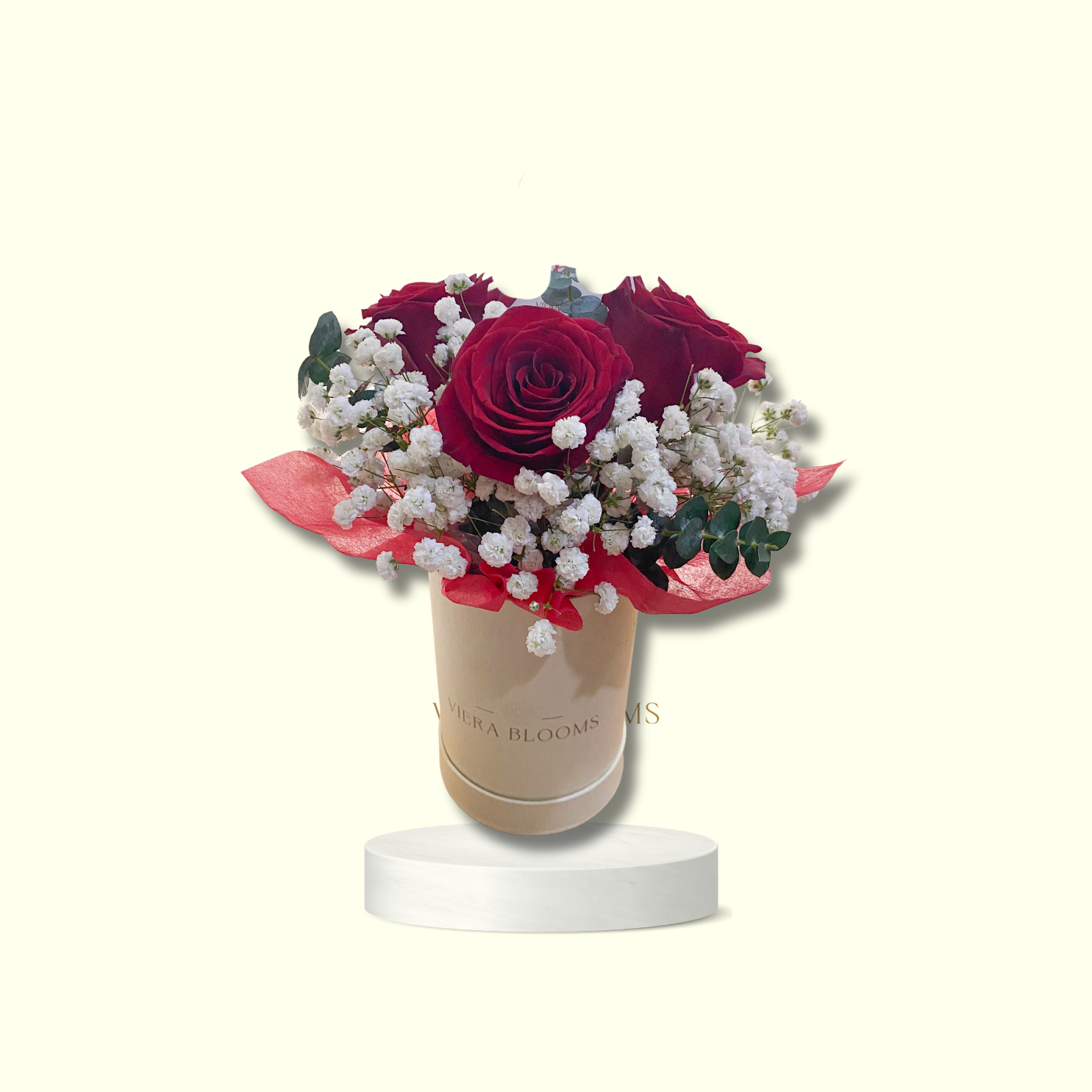 4 Imported Roses White Gypso and Eucalyptus Leaves arranged in 4D x6H (inches) Bloom Box. Fresh Blooms that can last upto 3-4 days with minimal proper care.