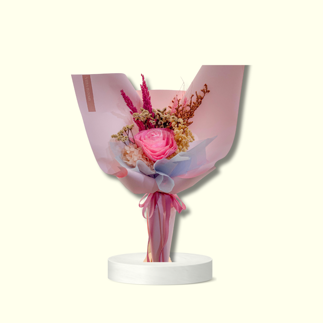 Single fossilized Rose, imported small mums sola (made of soft wood), cotton and with other imported dried flowers like gypso, bunny tail , misty,fern and hydrangea . Dried Blooms that can last upto 1-2 years with minimal care.