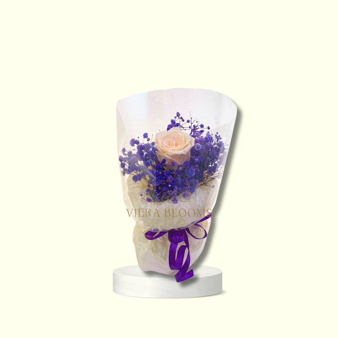 Single Preserved Peach Rose with other imported violet dried flowers like gypso. Dried Blooms that can last up to 2 years with minimal care.