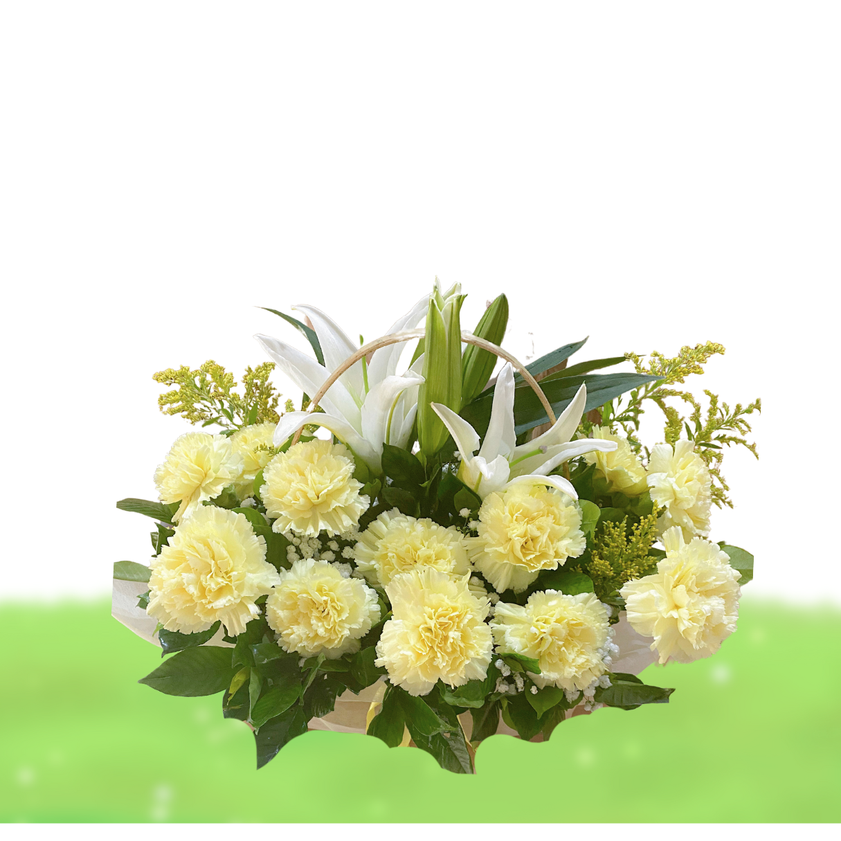 Components: 12 pcs yellow carnation,single lily and local leaves.