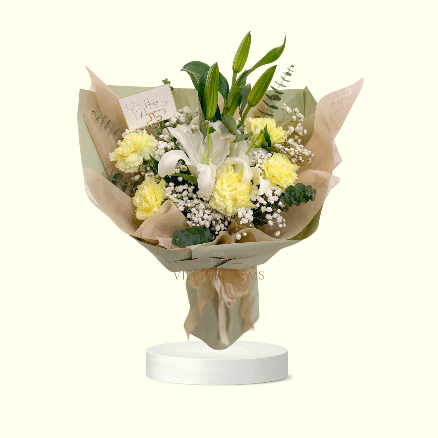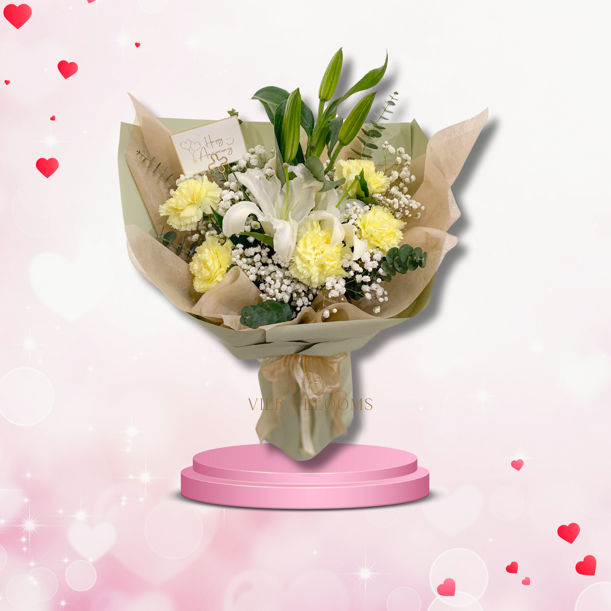 6 Yellow Carnations, Single Casa Blanca Lily with gypso and eucalyptus leaves. Fresh Blooms that can last upto 3-4 days with minimal proper care.