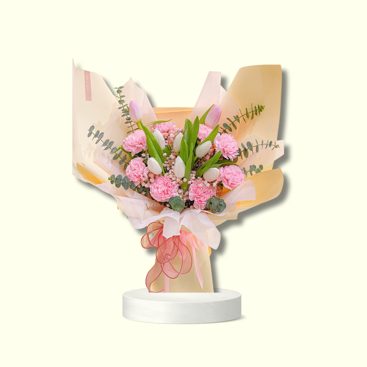 8 pcs. Tulips, 8 pcs. Pink Carnations, with Gypso and Eucalyptus Leaves. Fresh Blooms that can last up to 3-4 days with minimal proper care.