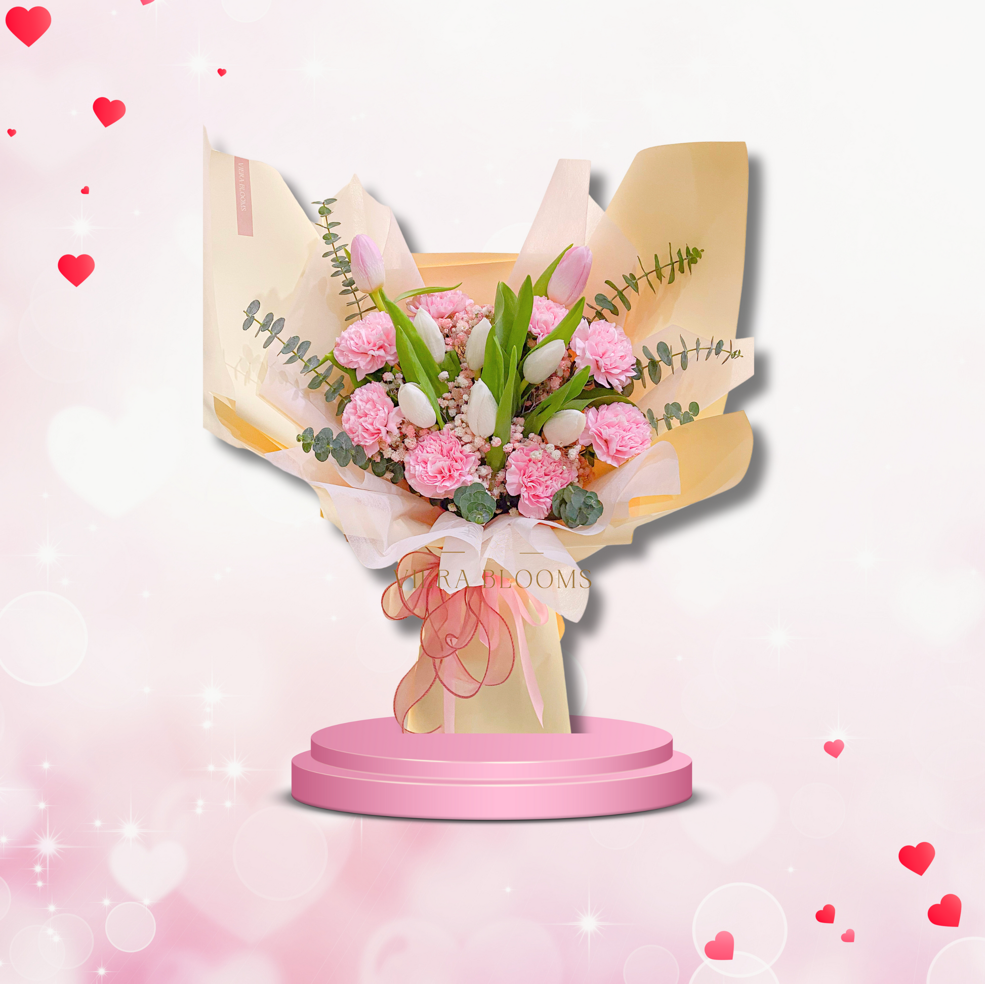 8 pcs. Tulips, 8 pcs. Pink Carnations, with Gypso and Eucalyptus Leaves. Fresh Blooms that can last up to 3-4 days with minimal proper care.