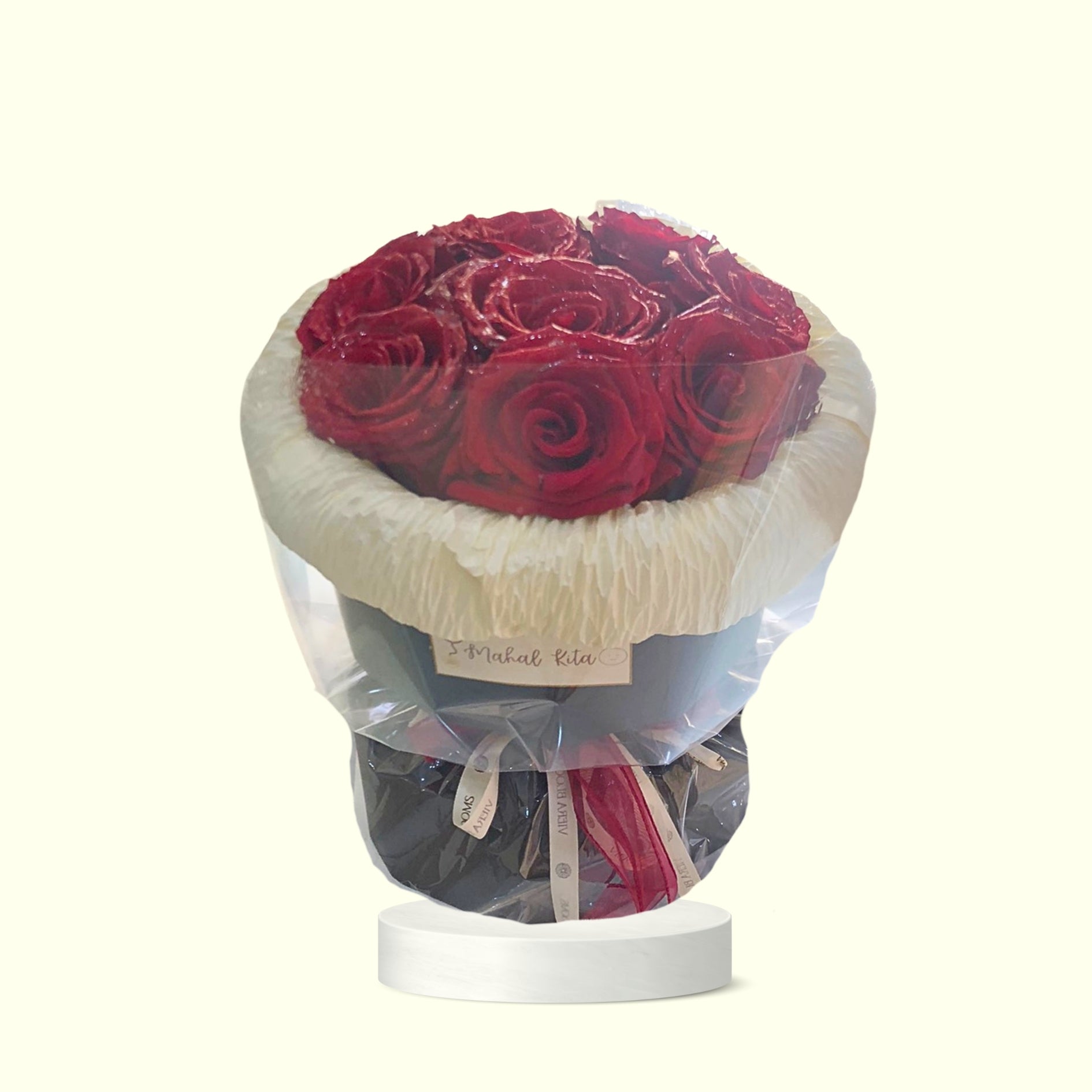 Please be advised that the floral and wrapping arrangement may vary from the sample picture, as each creation is crafted uniquely for you. The provided photos serve as visual aids, and subtle differences may arise. Kindly consider that the appearance of the flowers may be influenced by variations in brightness and contrast settings. Additionally, to ensure their freshness upon delivery, you might receive buds or flowers in various stages of bloom.