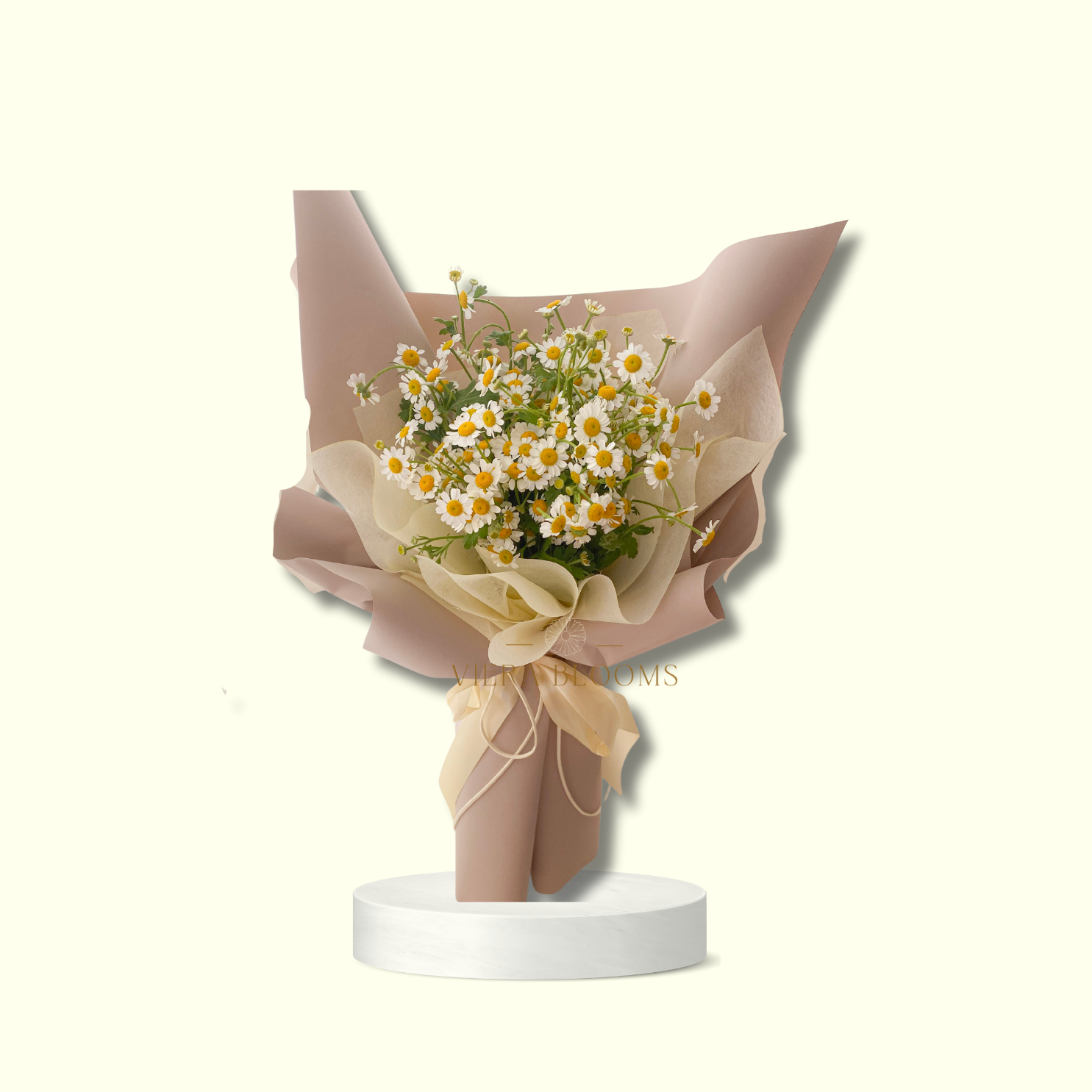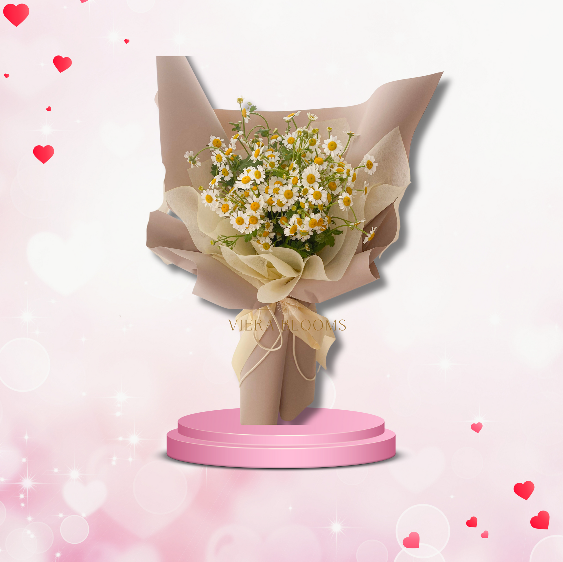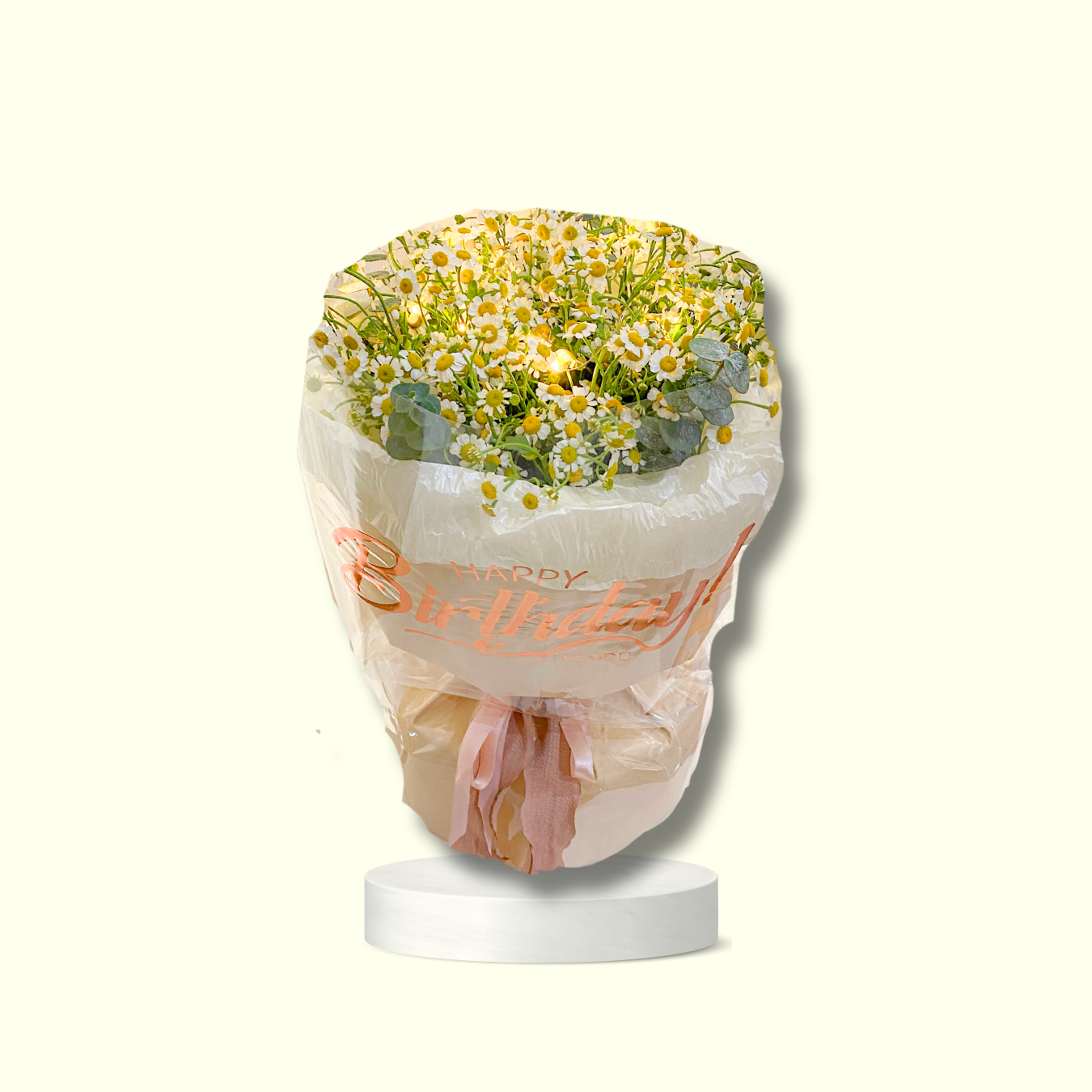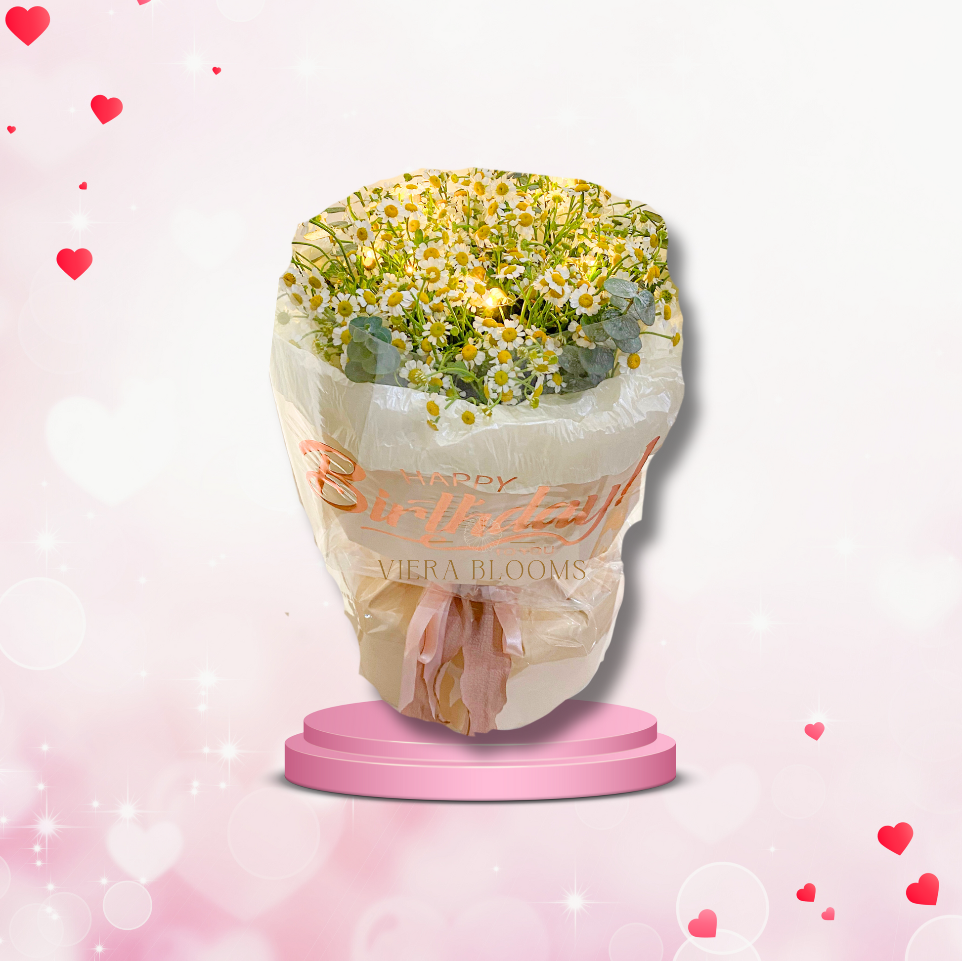 Bouquet of Chamomile with Eucalyptus Leaves. Fresh Blooms that can last upto 3-4 days with minimal proper care. Place in a cool, dry place.