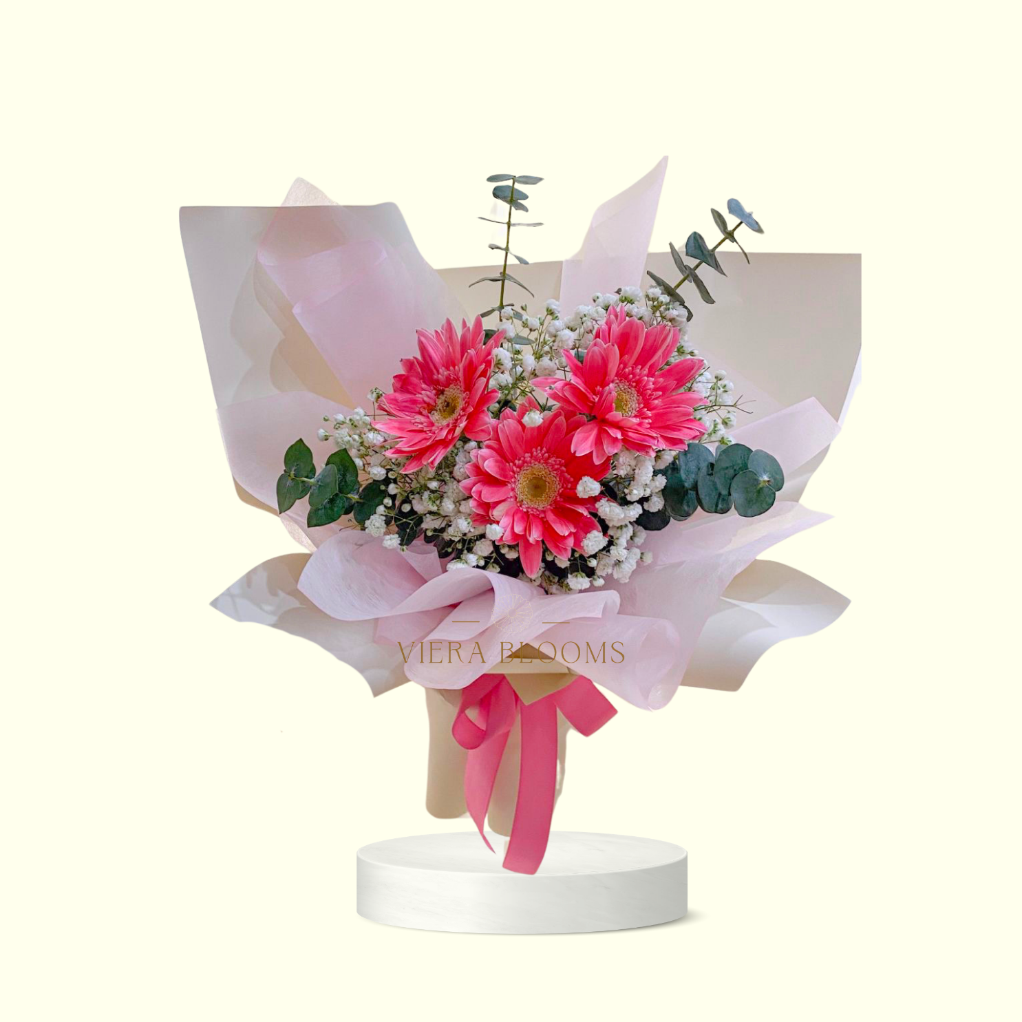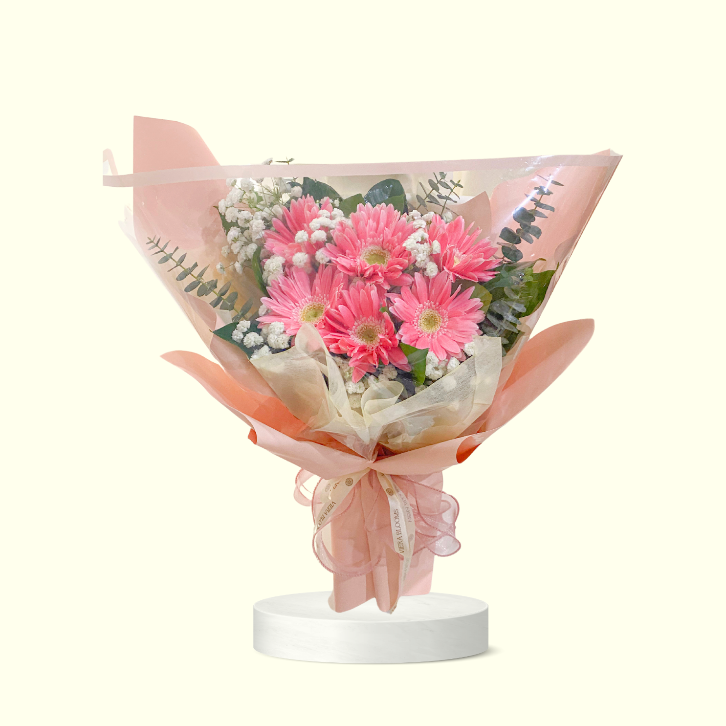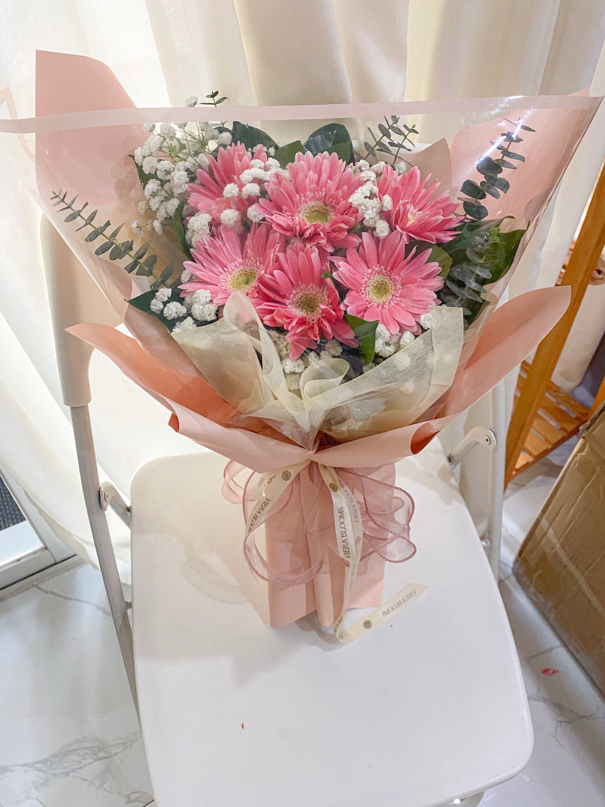 Pink Gerbera with imported fillers like eucalyptus and gypso. Fresh blooms can last up to 3-4 days with proper care.