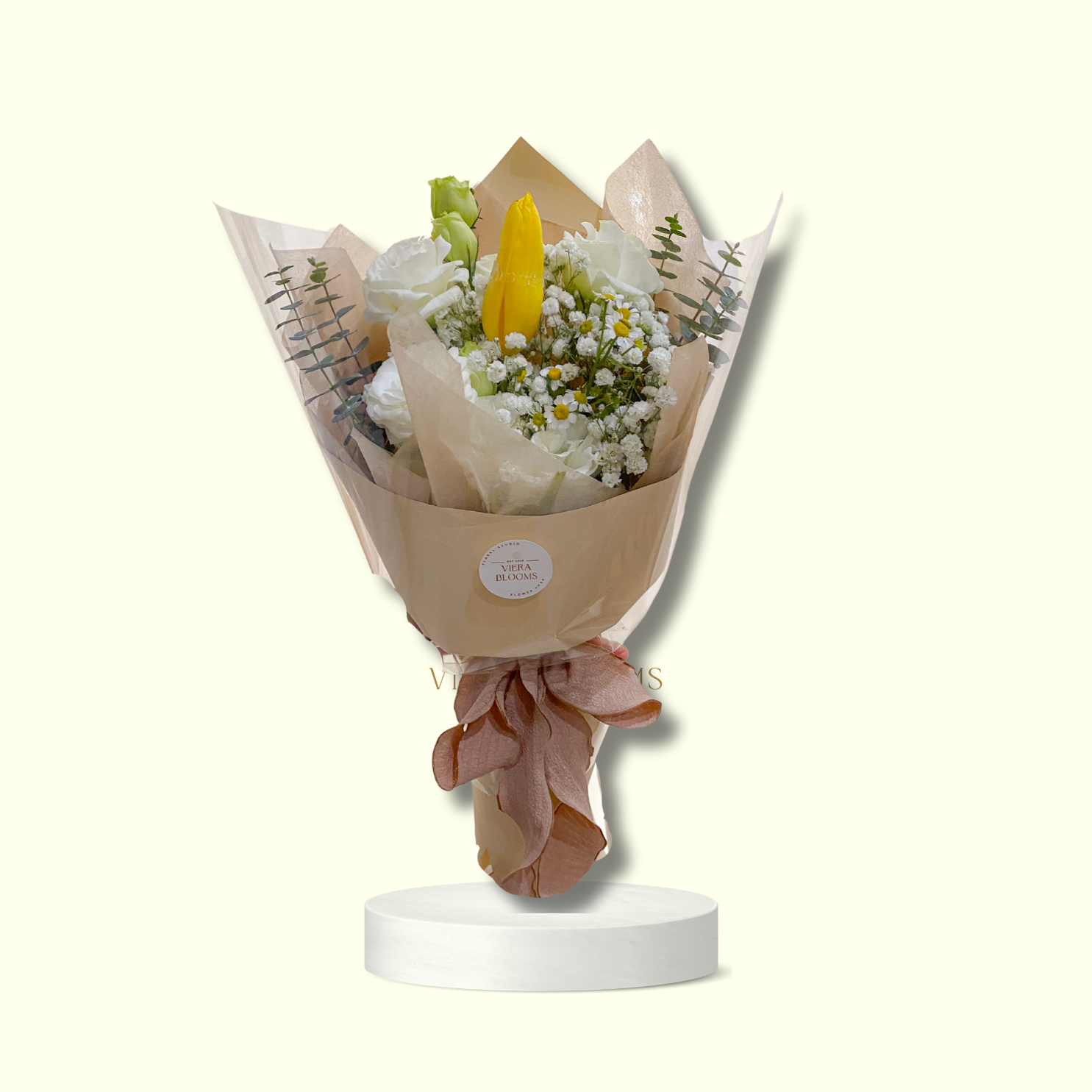 Please be advised that the floral and wrapping arrangement may vary from the sample picture, as each creation is crafted uniquely for you. The provided photos serve as visual aids, and subtle differences may arise. Kindly consider that the appearance of the flowers may be influenced by variations in brightness and contrast settings. Additionally, to ensure their freshness upon delivery, you might receive buds or flowers in various stages of bloom.