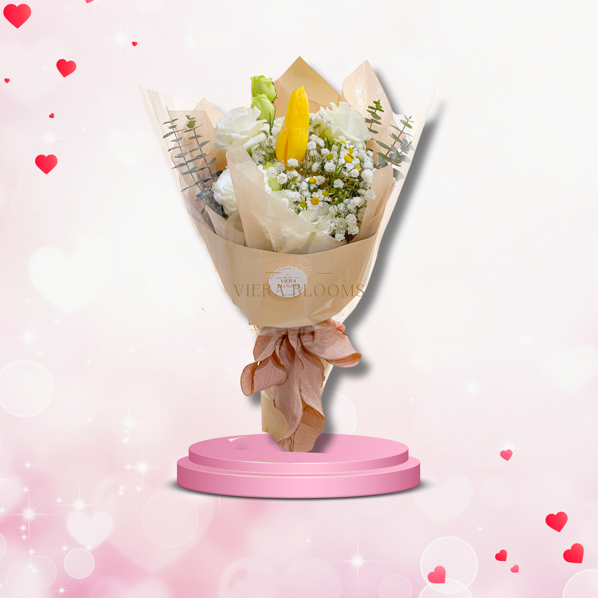 Single Tulip, Gypso,4 stems Lisianthus (5-7 heads) , Chamomile , Eucalyptus Leaves. Fresh Blooms that can last upto 3-4 days with minimal proper care.