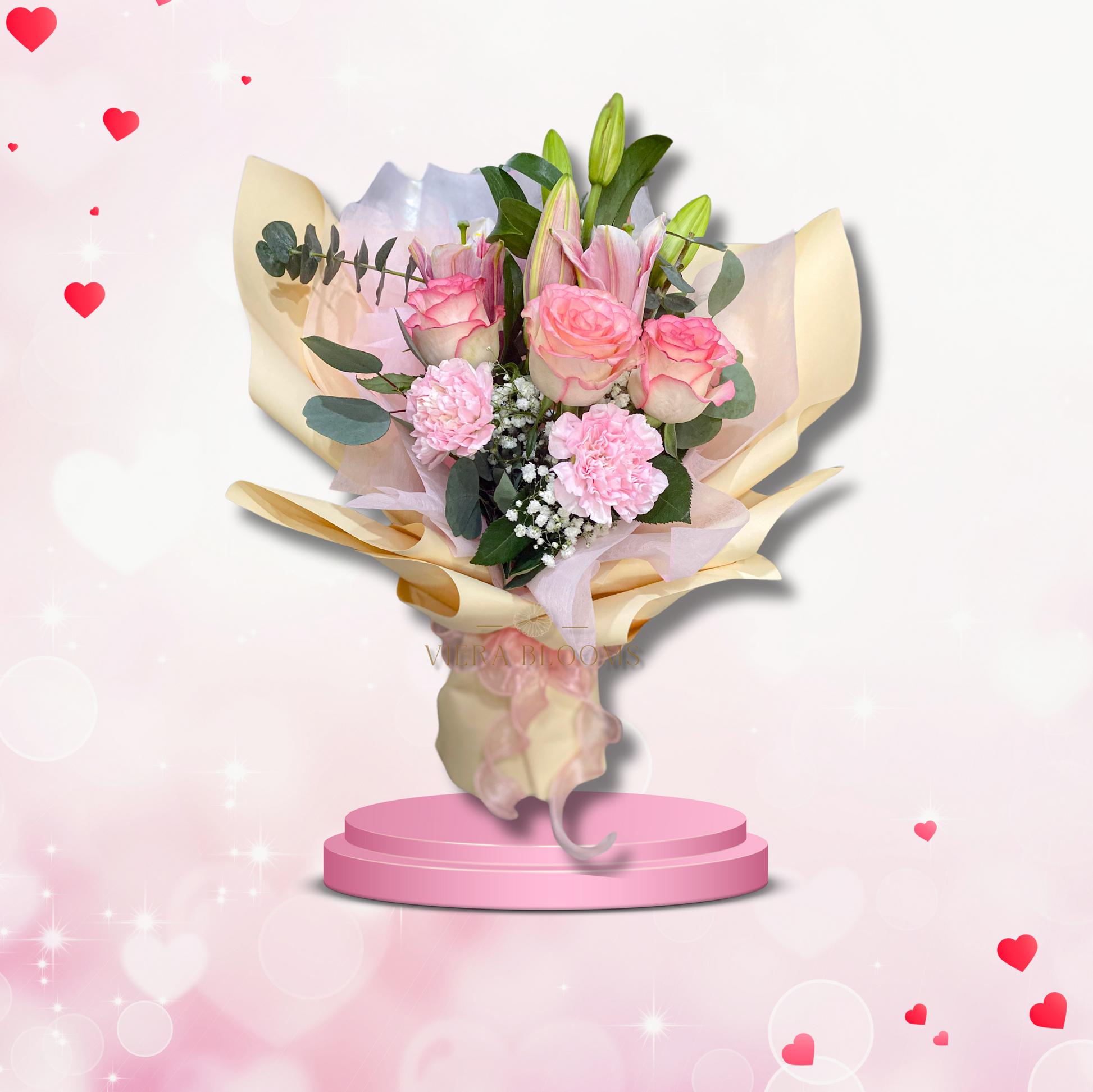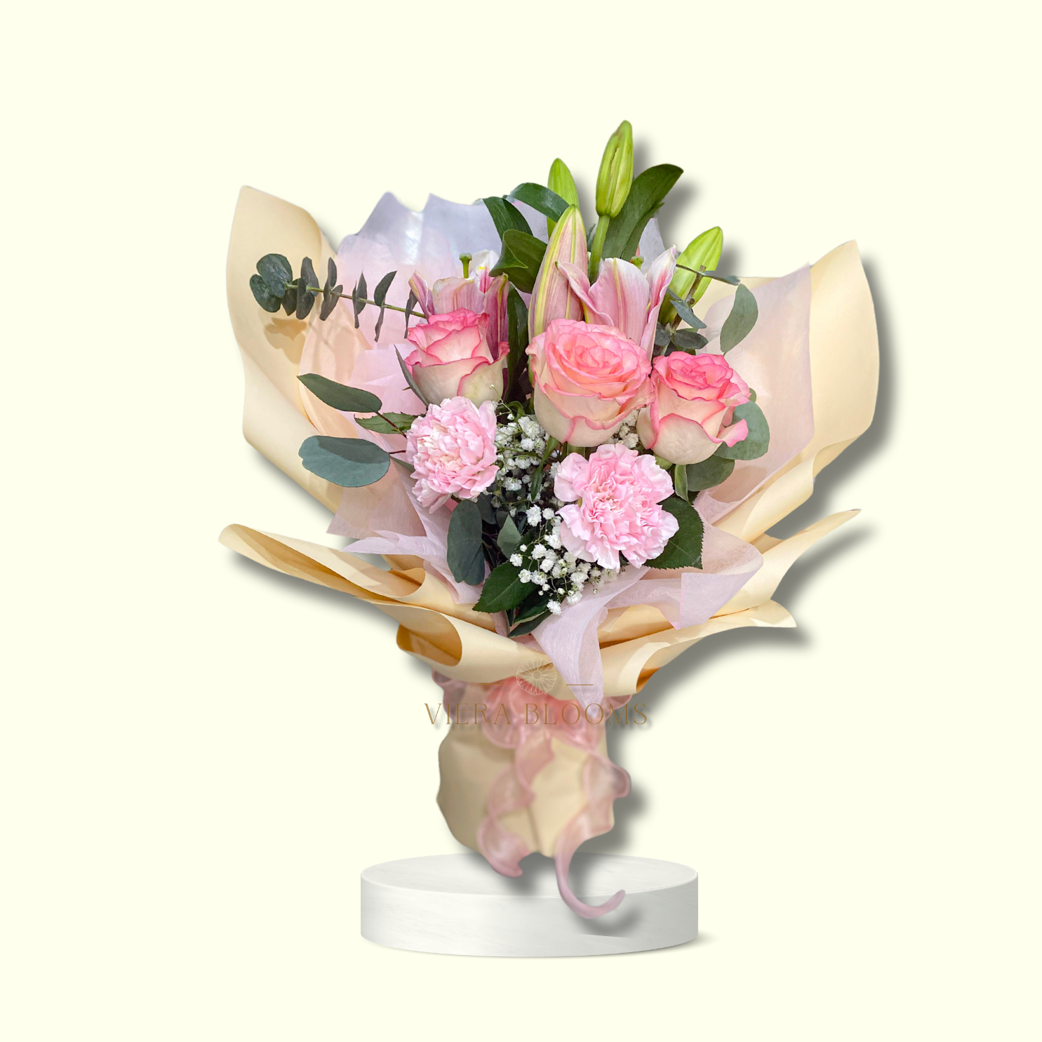 4 Imported Pink Roses, 4 Carnations, Single stargazer, white Lisianthus (small wite rose) , Gypso with Eucalyptus Leaves. Fresh Blooms that can last upto 3-4 days with minimal proper care.