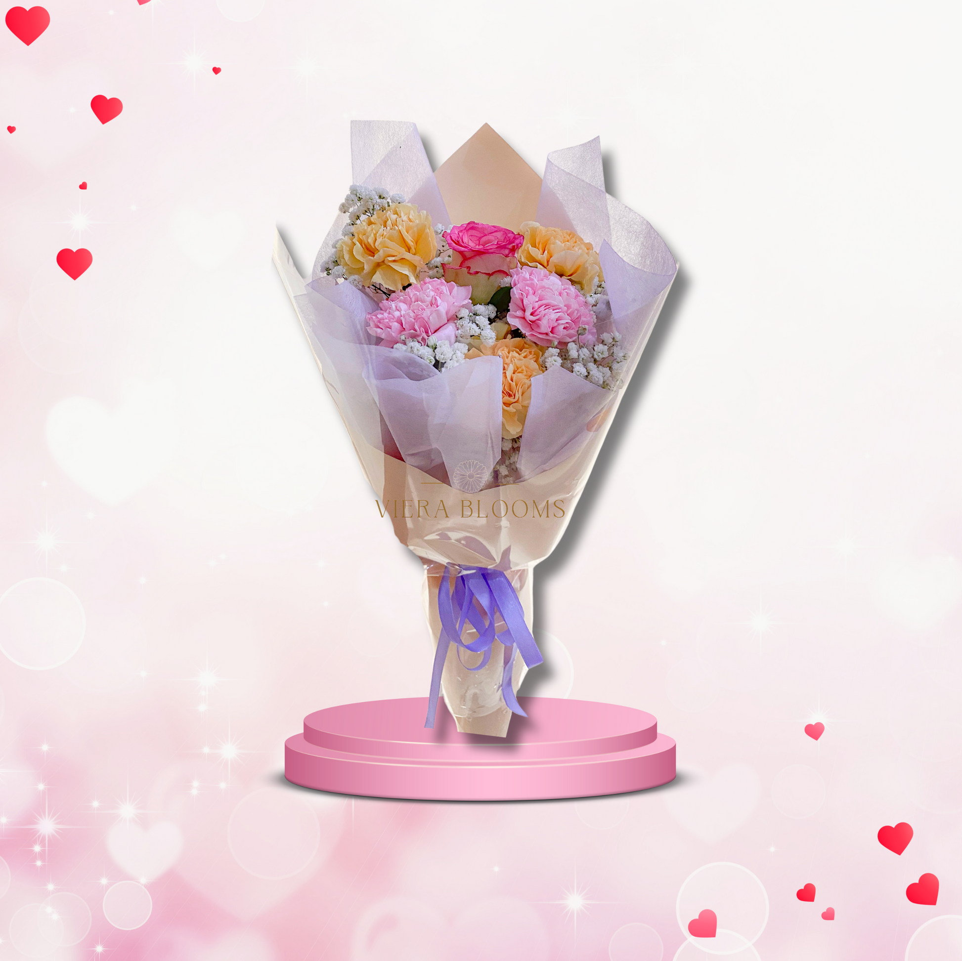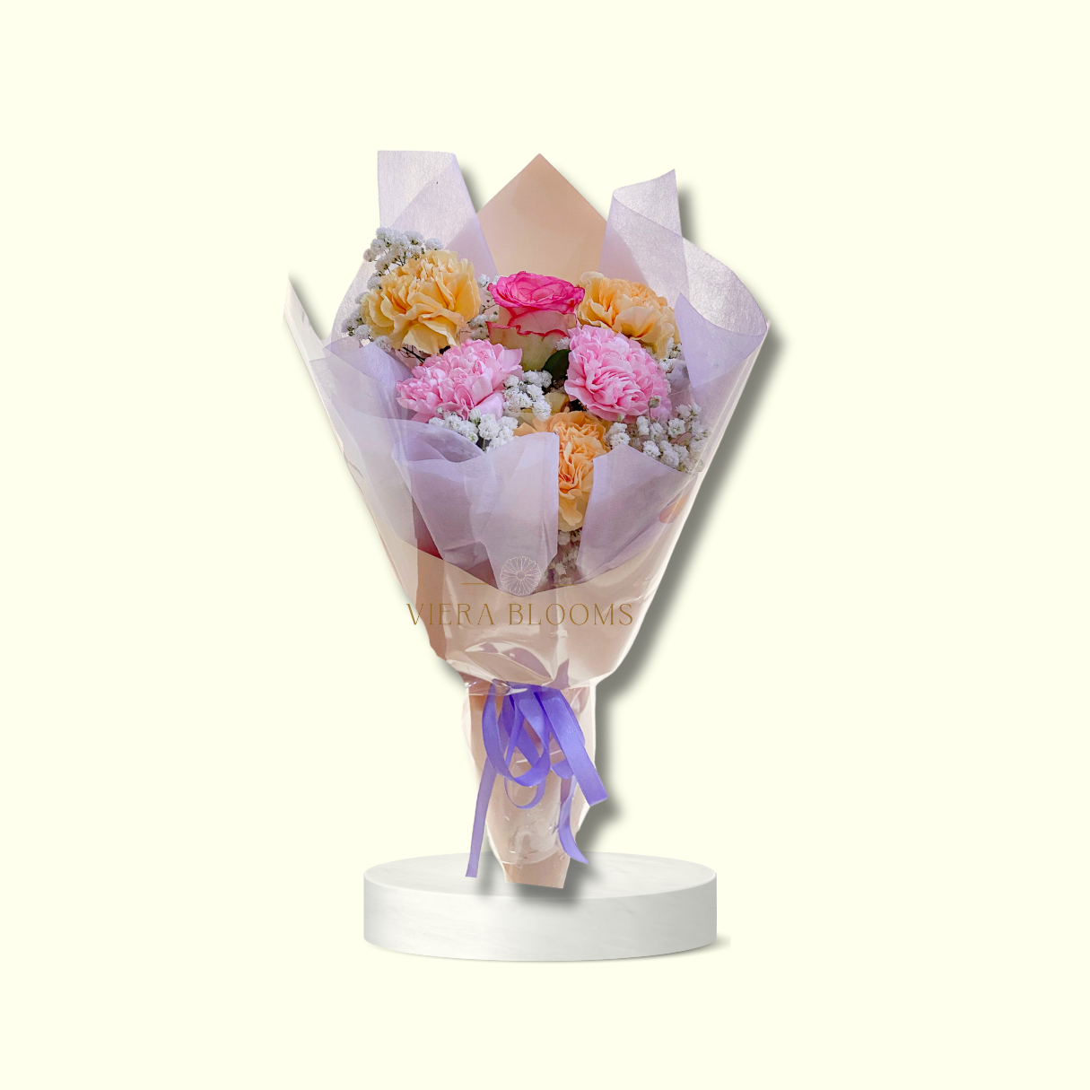 Please be advised that the floral and wrapping arrangement may vary from the sample picture, as each creation is crafted uniquely for you. The provided photos serve as visual aids, and subtle differences may arise. Kindly consider that the appearance of the flowers may be influenced by variations in brightness and contrast settings. Additionally, to ensure their freshness upon delivery, you might receive buds or flowers in various stages of bloom.