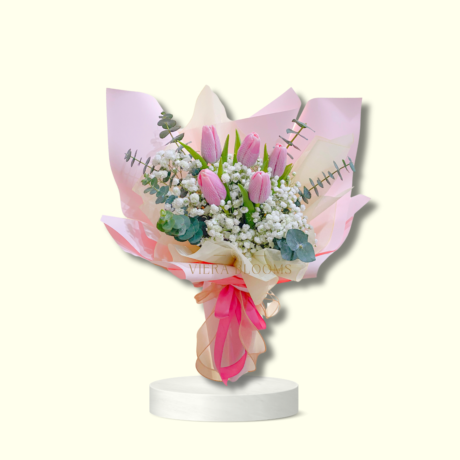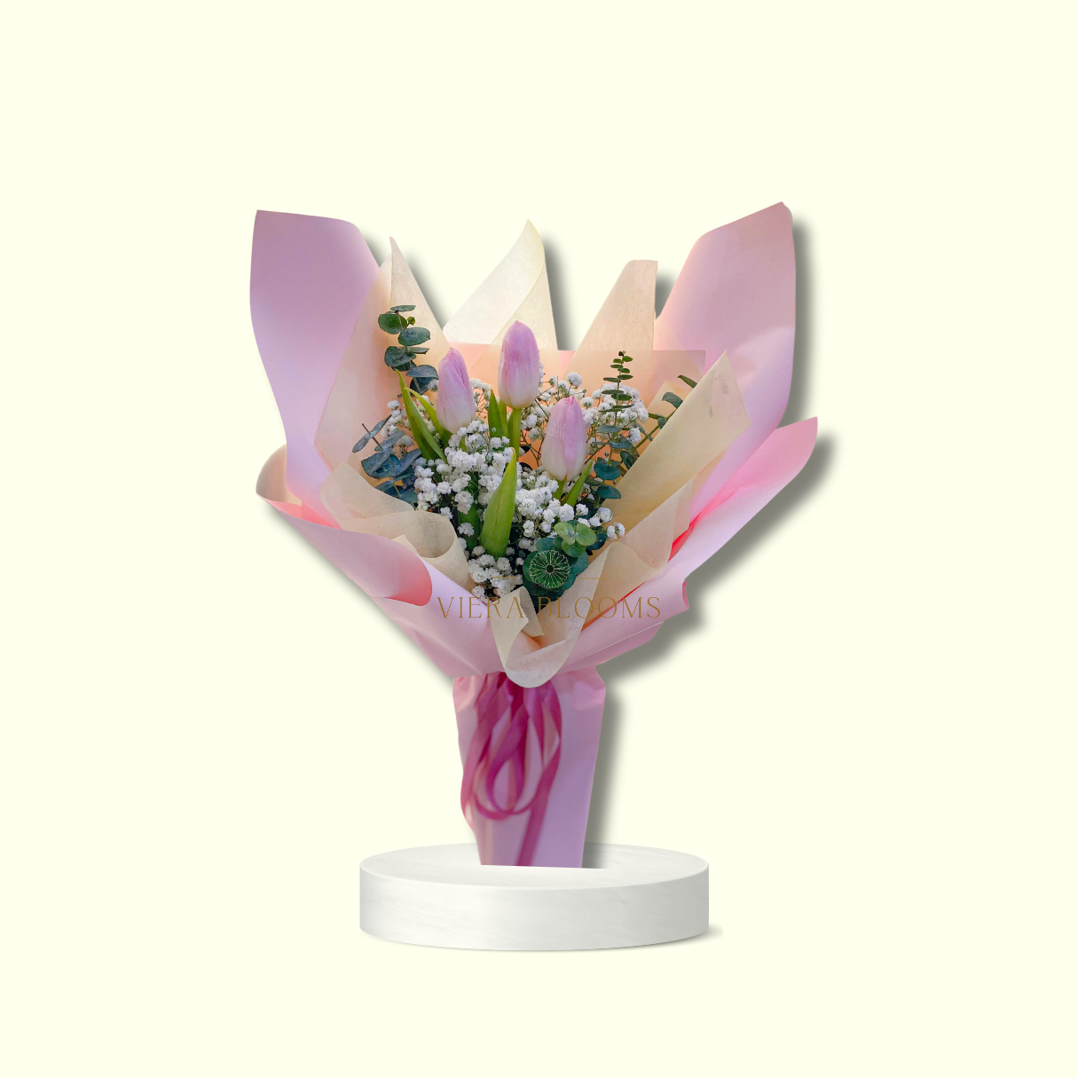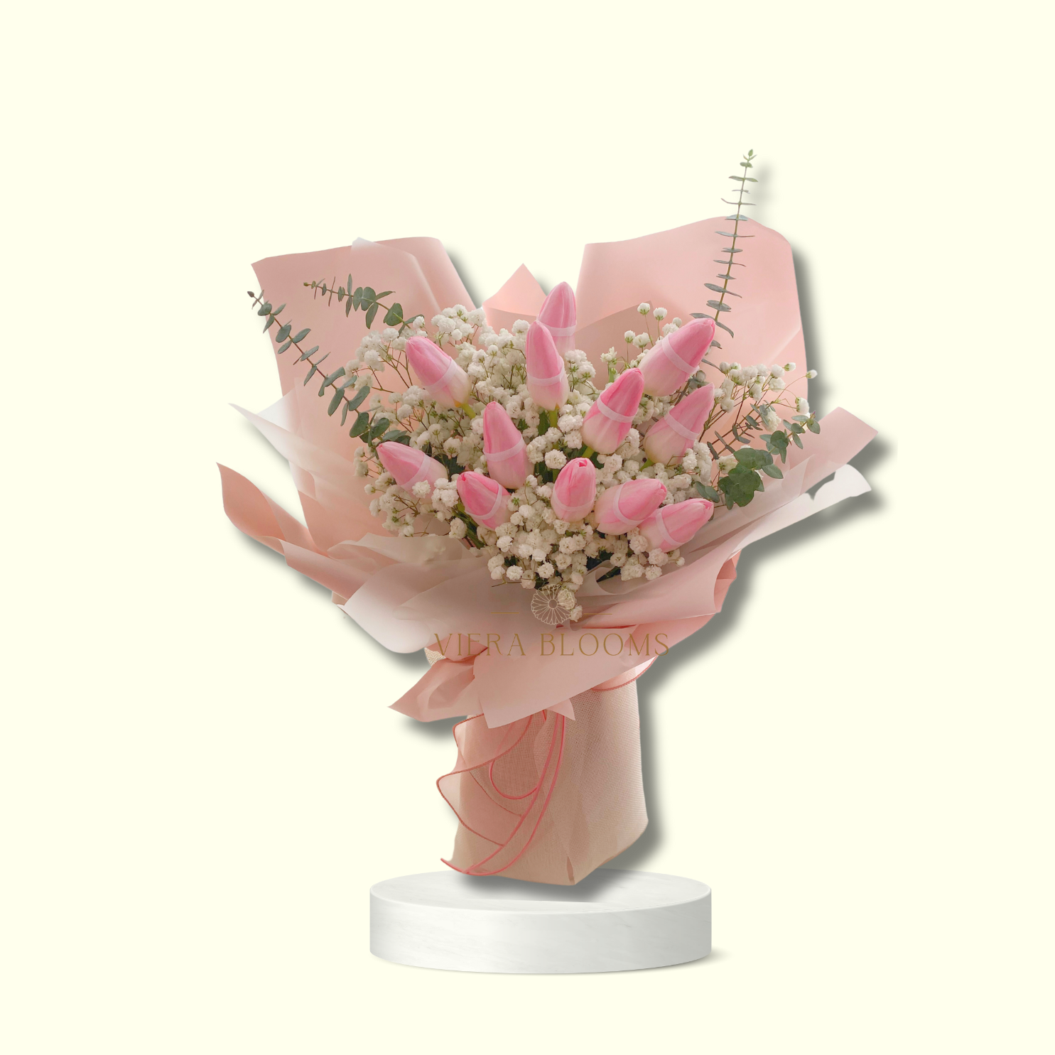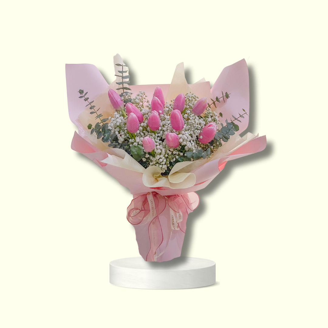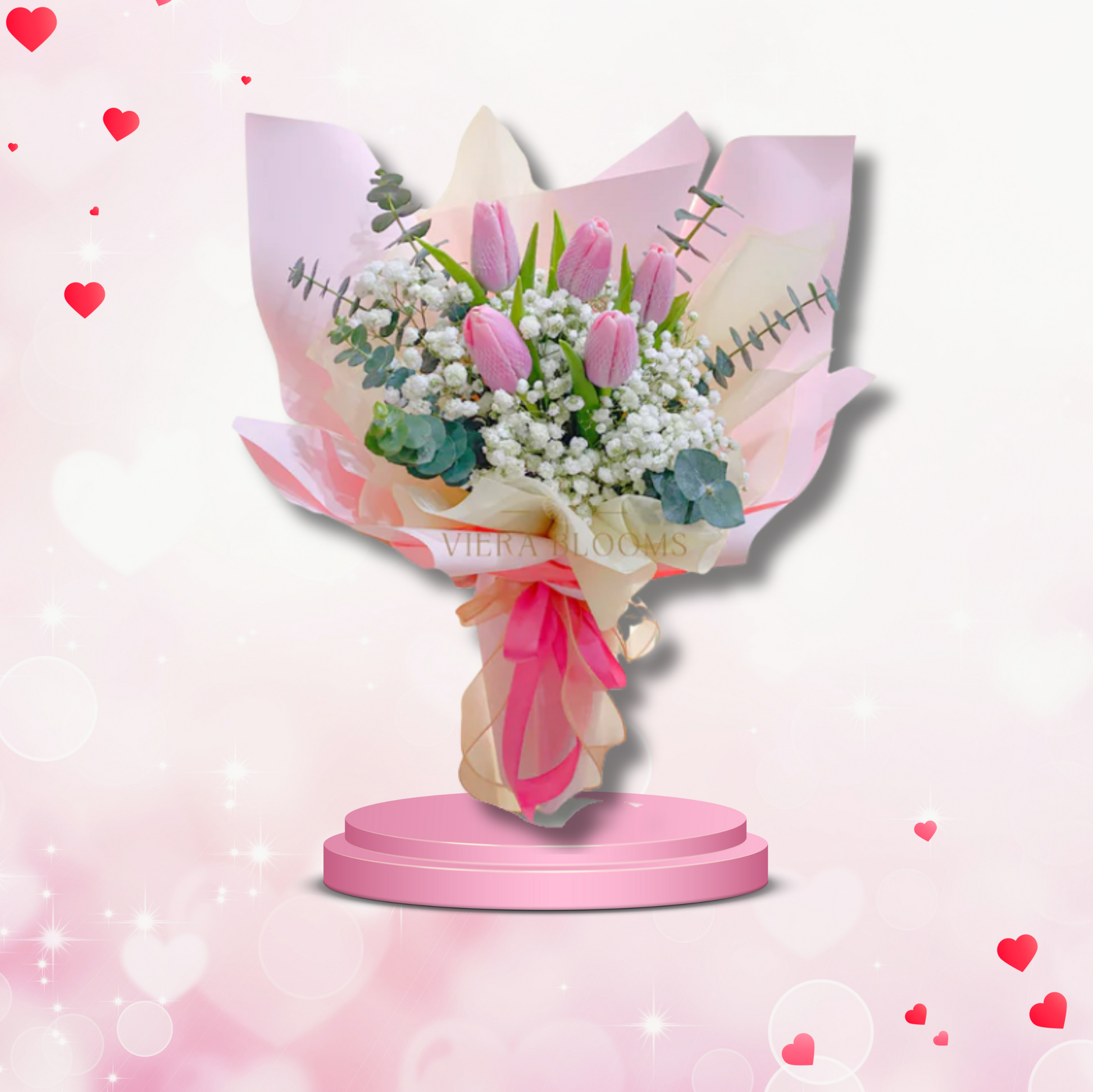 Pink Holland Tulips with Gypso and Eucalyptus Leaves. Fresh Blooms that can last upto 3-5 days with minimal proper care.