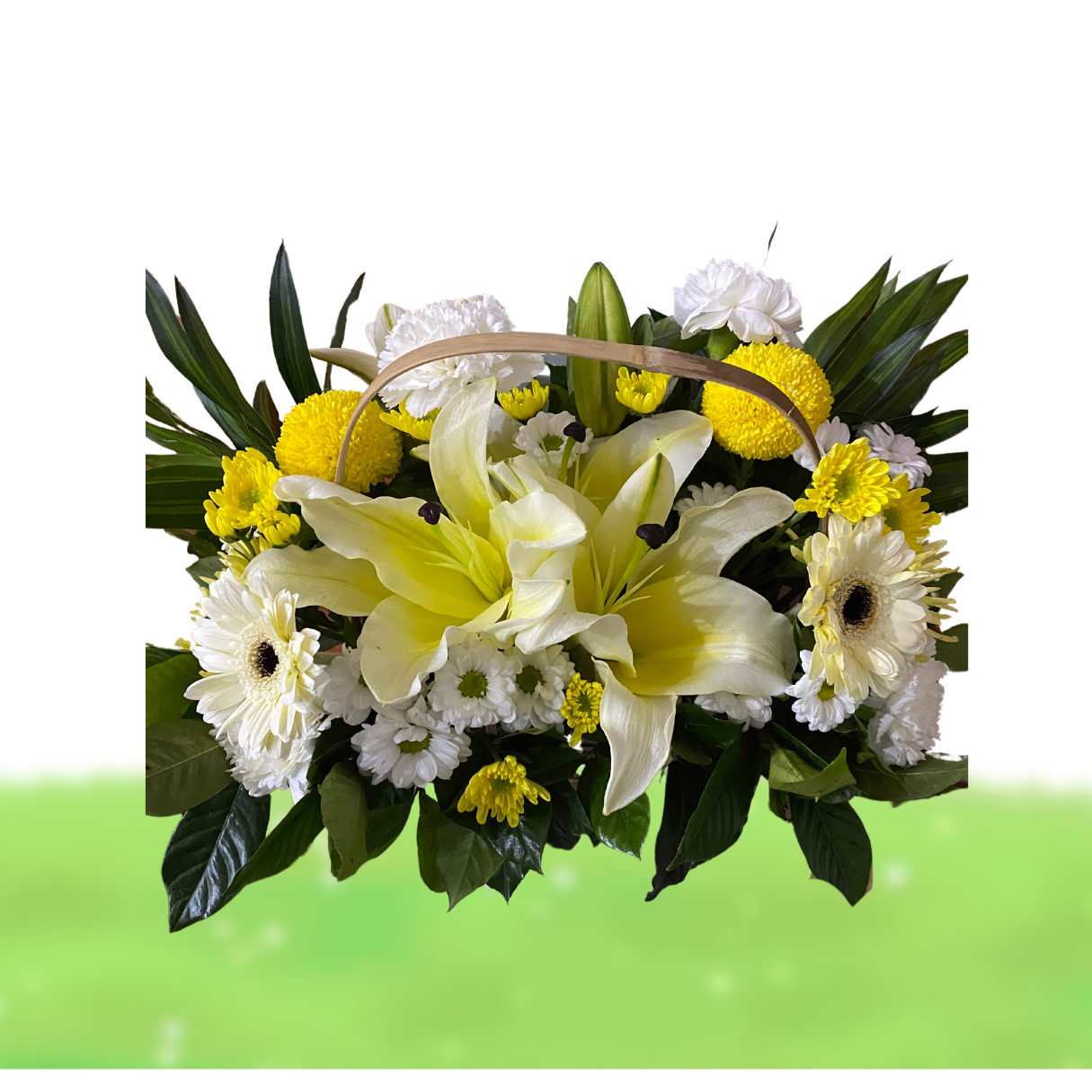Components: Single yellow lily,pimpong,assorted mums,white gerbera,white carnations and local leaves.