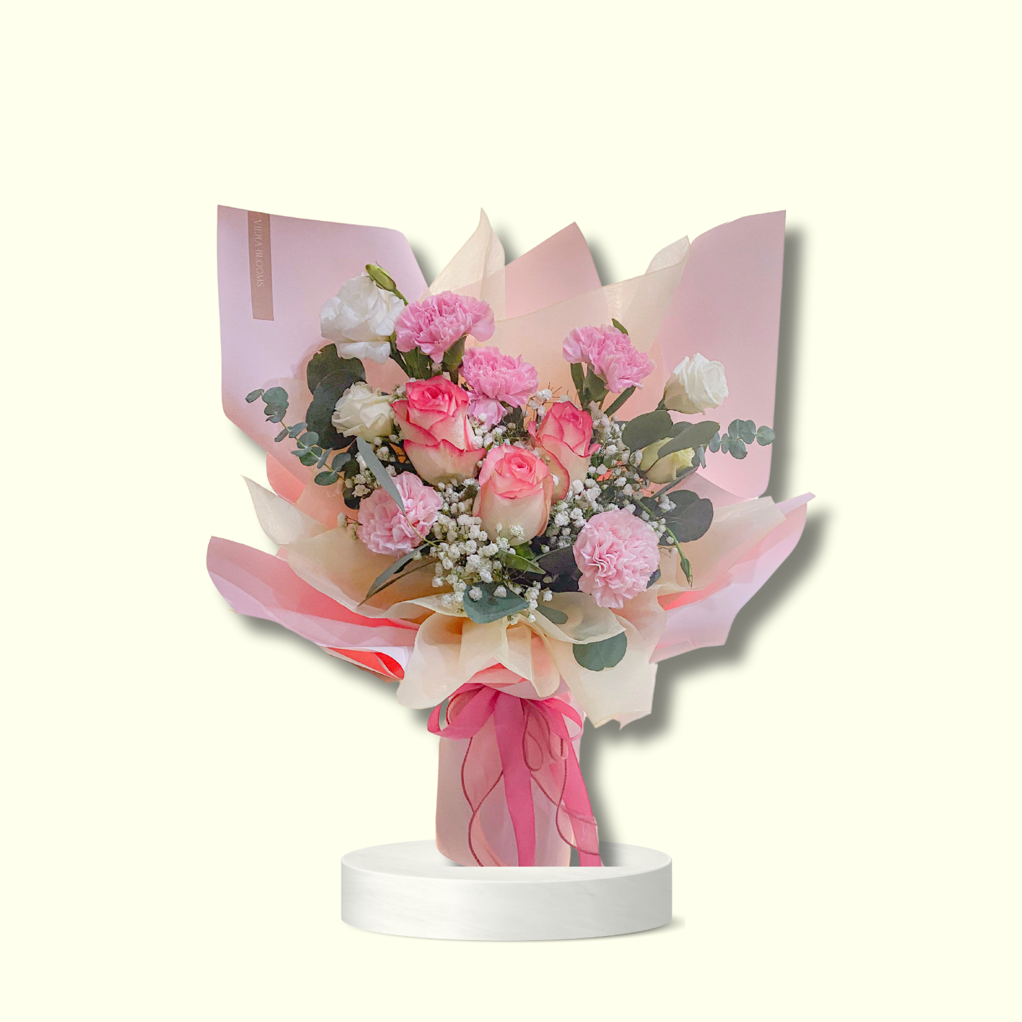 3 Imported Two toned Roses,6 pink carnations,3-4 stems White Lisianthus, Gypso with Eucalyptus Leaves. Fresh Blooms that can last upto 3-4 days with minimal proper care.