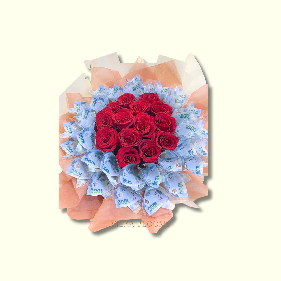 Viera Style Classic Money Bouquet Arrangement with fresh Red Ecuadorian Roses (14 pcs).