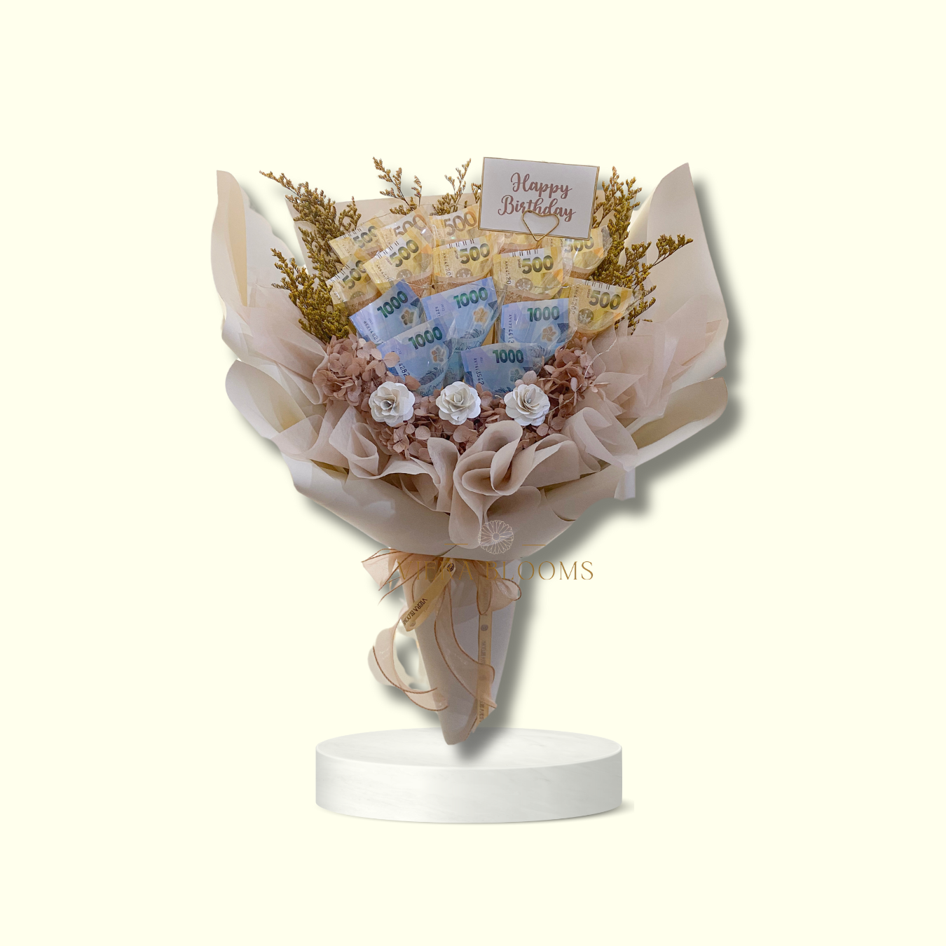 Viera Style Classic Money Bouquet Arrangement. Arrangement with real dried flowers and wooden roses. Dried flowers (hydrangea and misty) can last up to 2-3 years with minimal proper care.