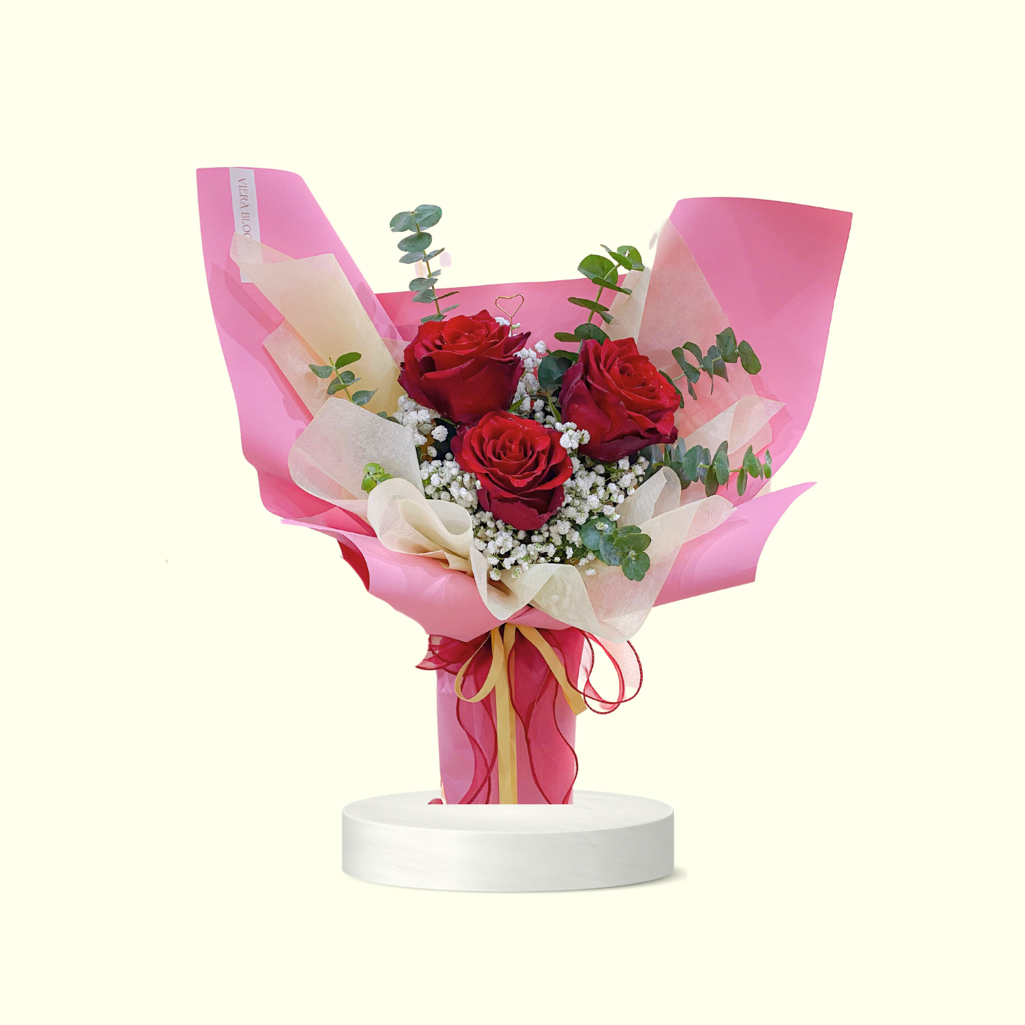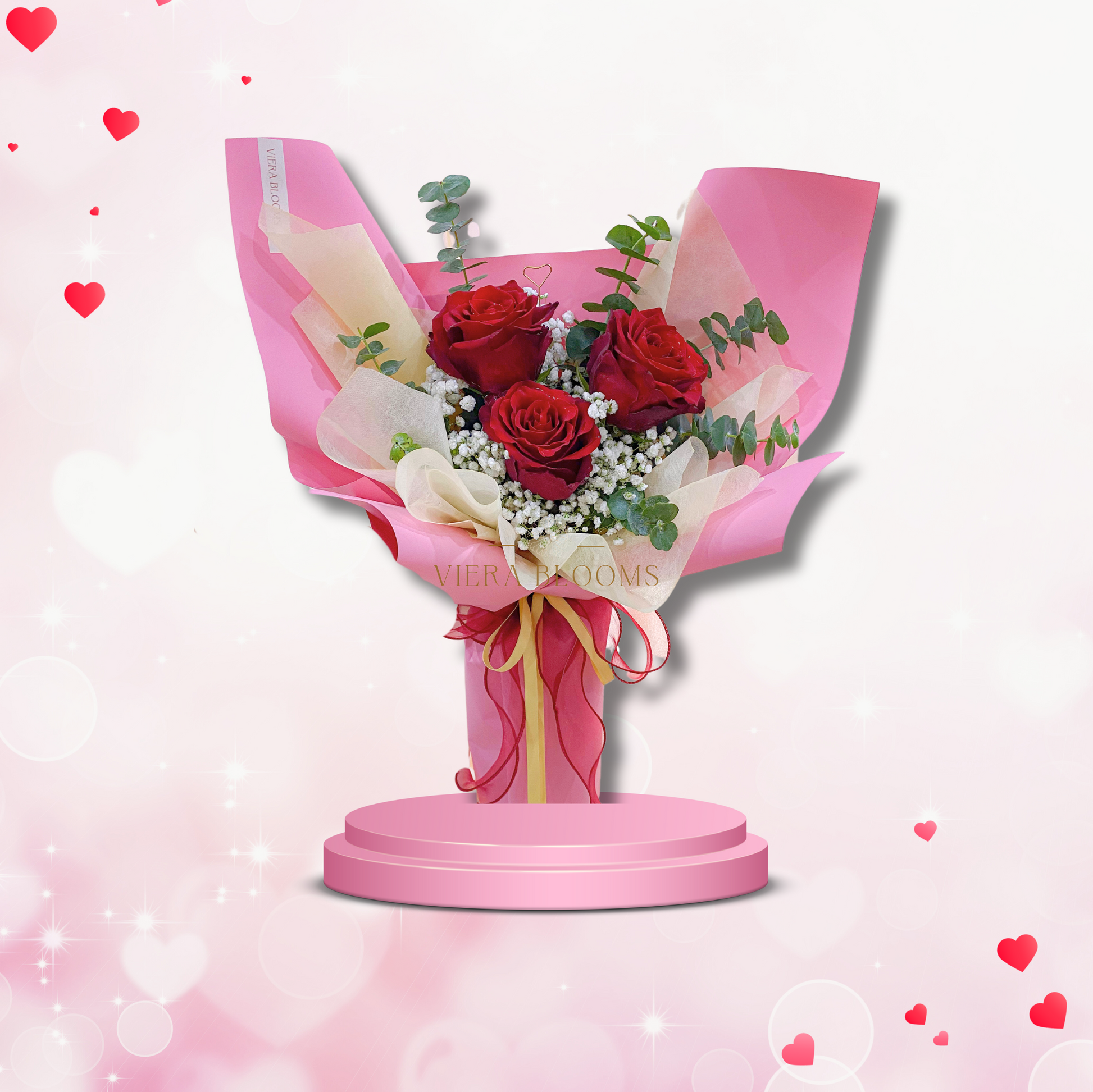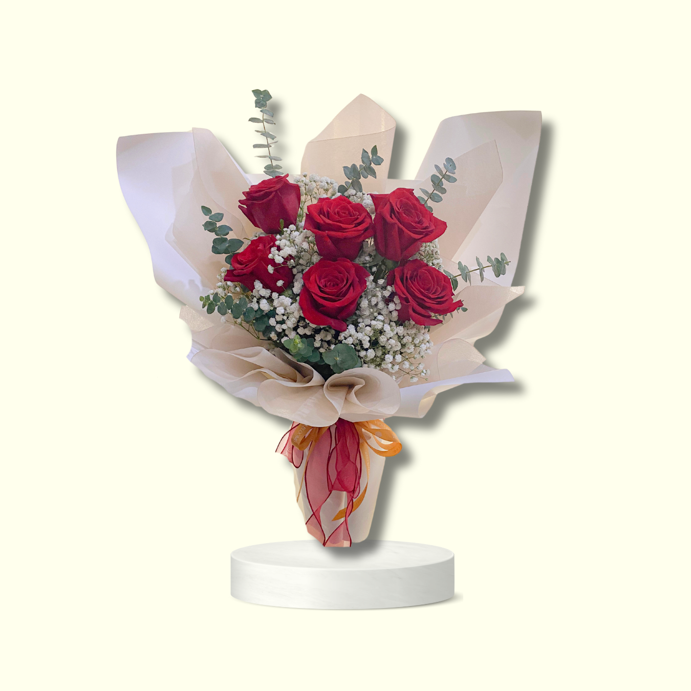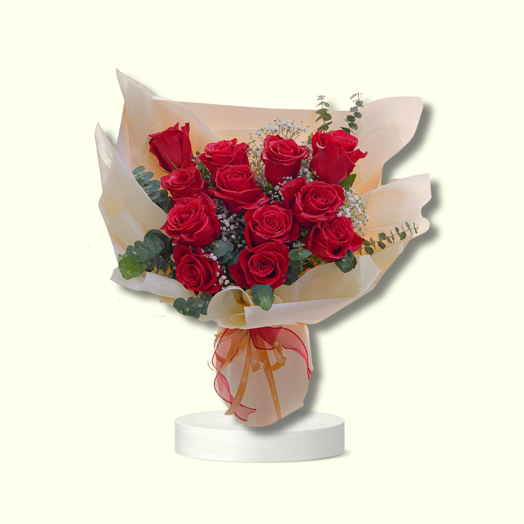 Bouquet Arrangement of Red Ecuadorian Roses with Gypso and Eucalyptus leaves . Fresh Blooms that can last upto 3-4 days with minimal proper care.