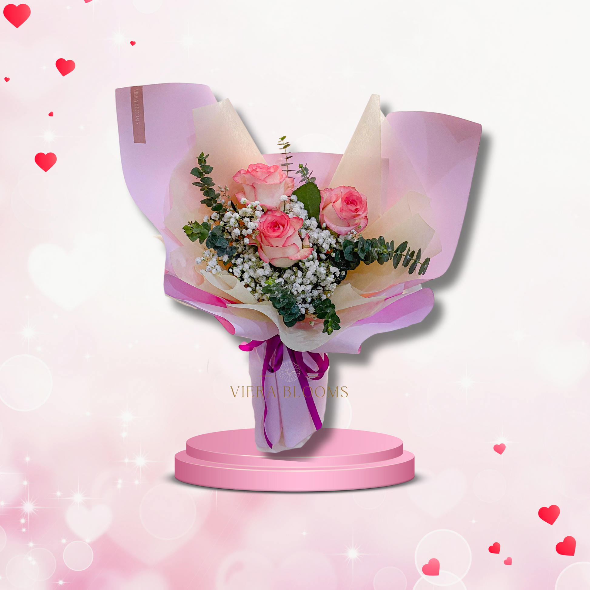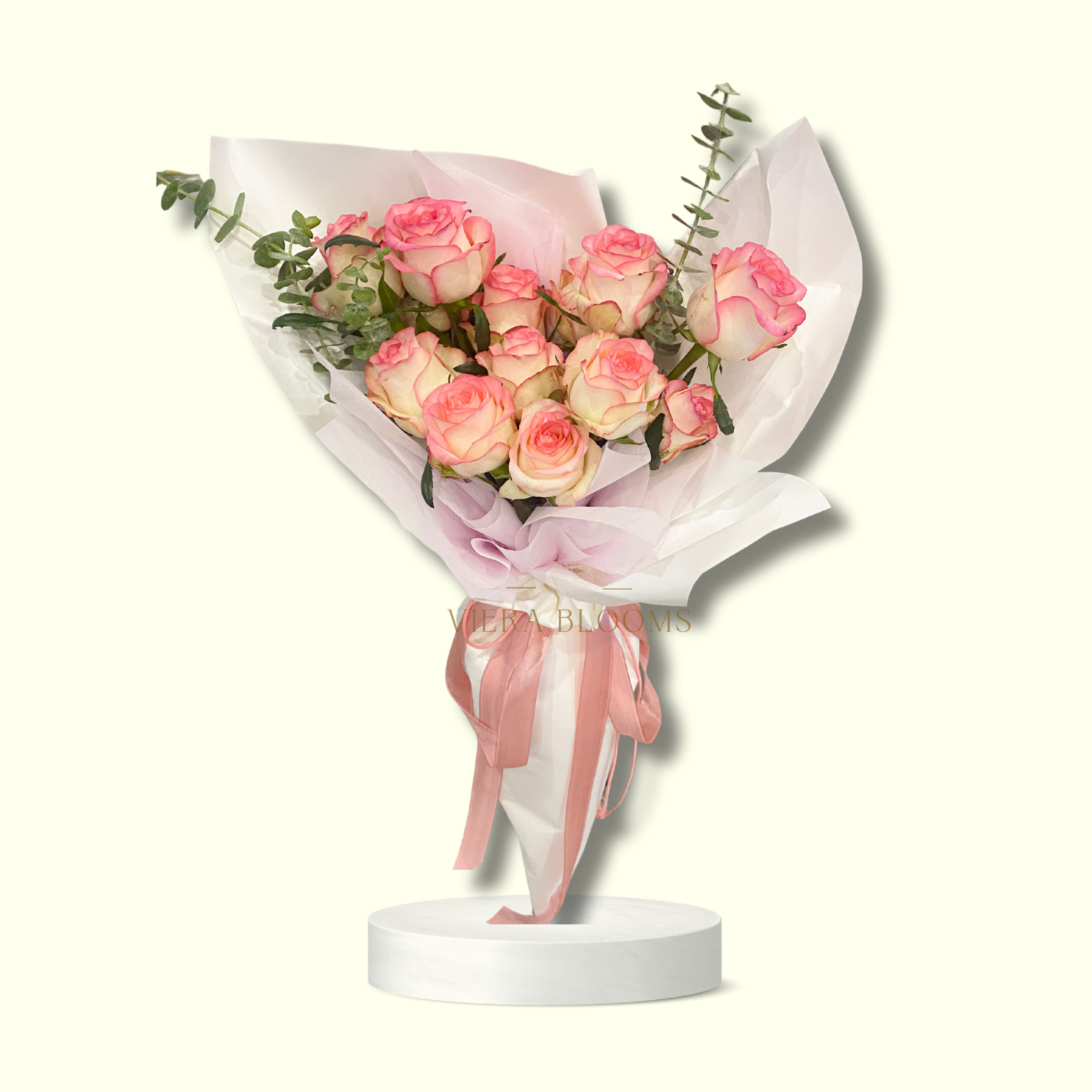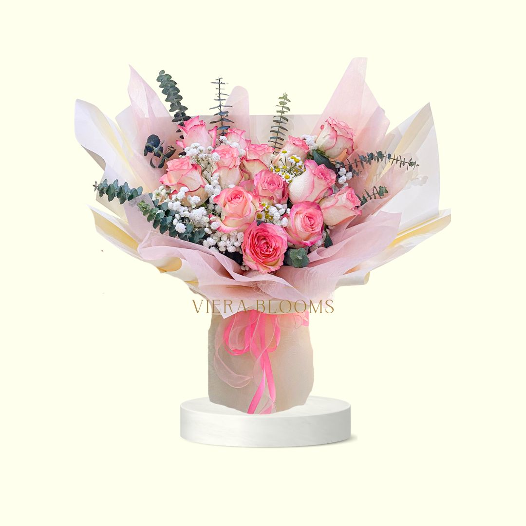 Imported two-toned Pink Roses with Gypso and/or Eucalyptus Leaves. Fresh Blooms that can last upto 3-4 days with minimal proper care.