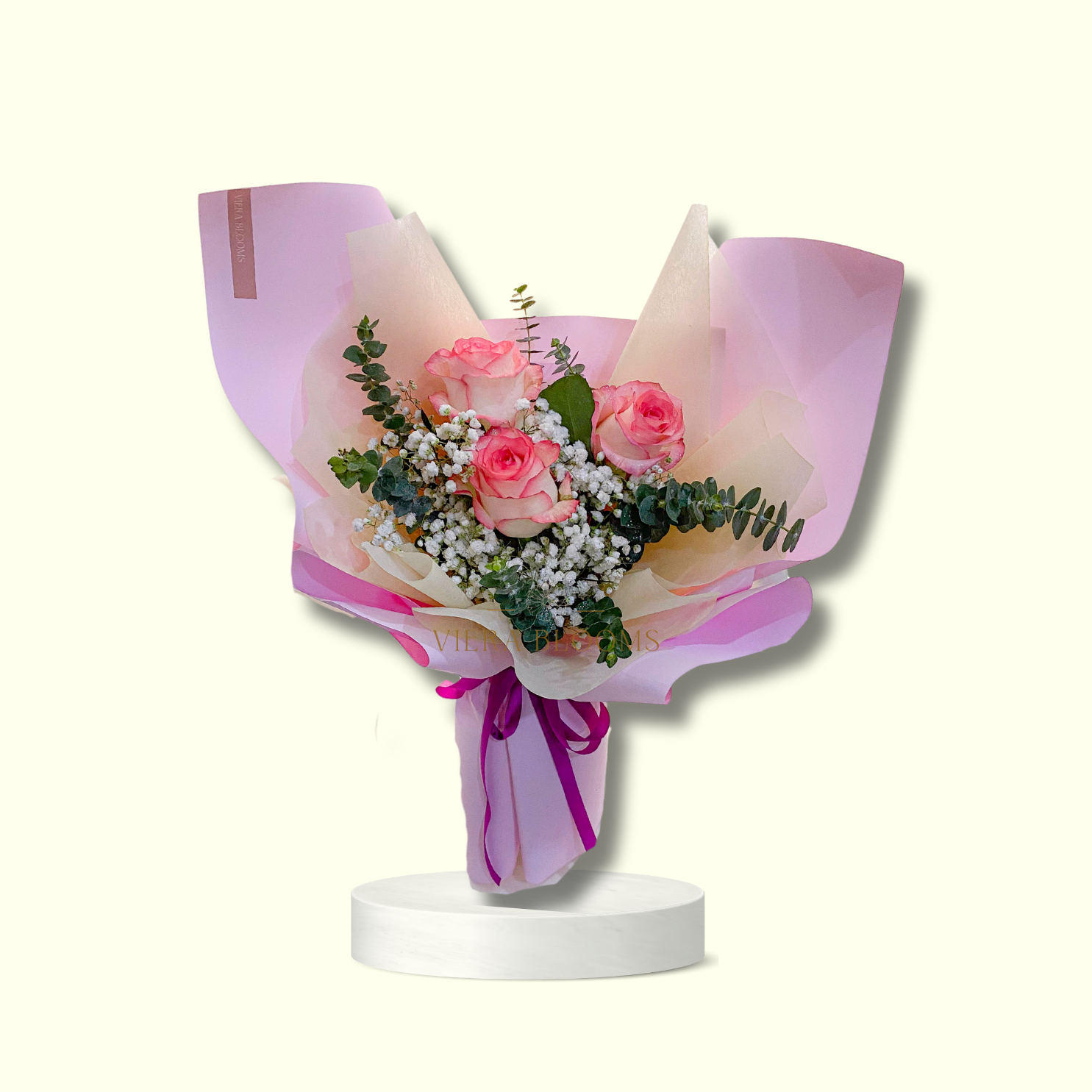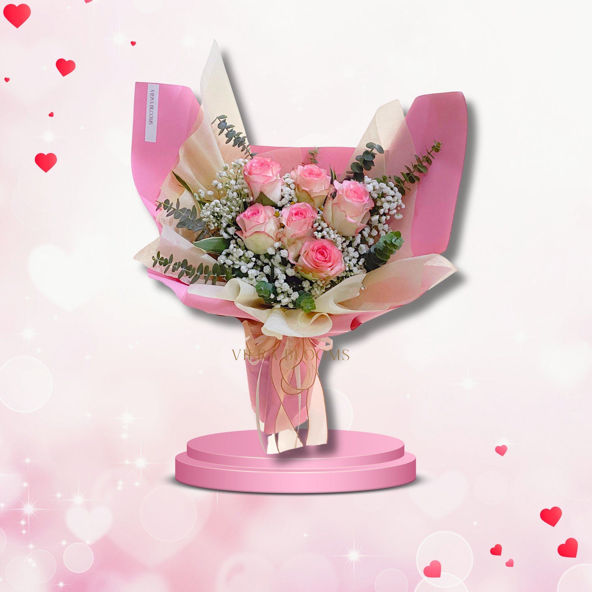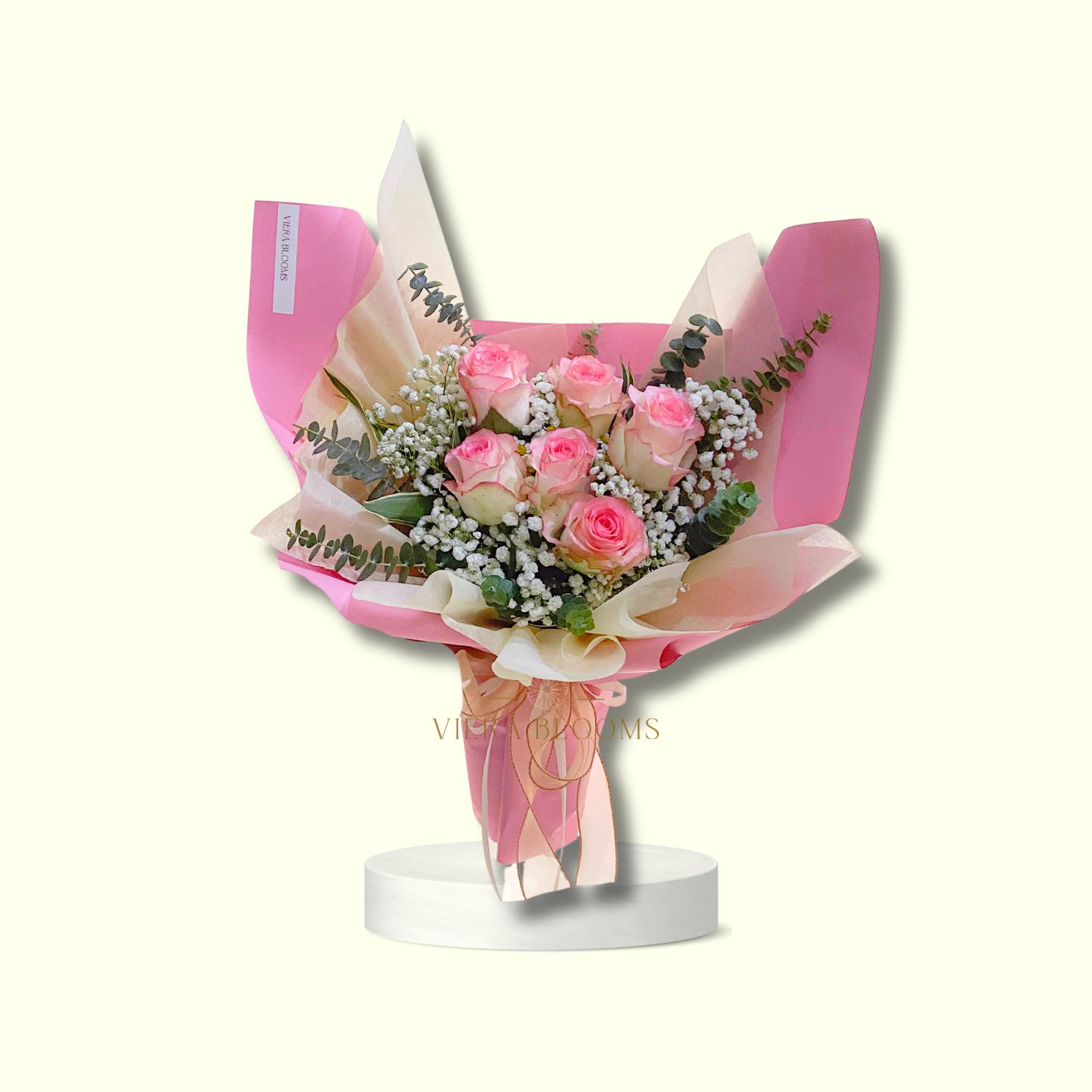 Imported two-toned Pink Roses with Gypso and/or Eucalyptus Leaves. Fresh Blooms that can last upto 3-4 days with minimal proper care.