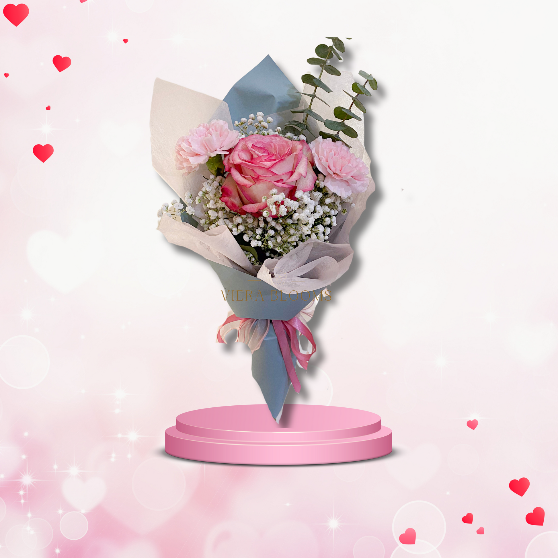 SIngle Ecuadorian Rose with 2 Pink Carnation, fresh Gypso and Eucalyptus Leaves. Fresh Blooms that can last up to 3-4 days with minimal proper care.
