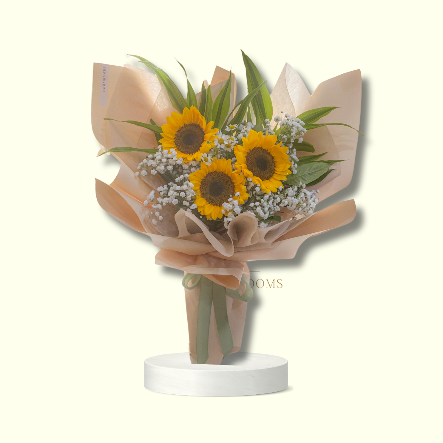3 sunflower with whiteGypso and Eucalyptus. Fresh Blooms that can last upto 3-4 days with minimal proper care.