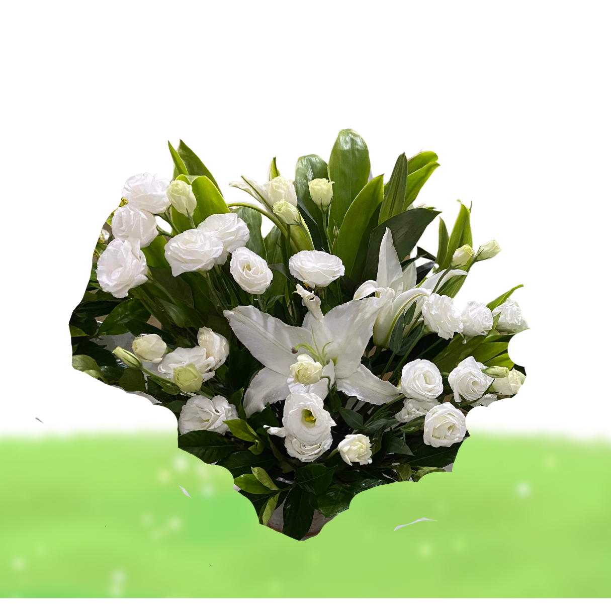 Components: Single white lily 6-8 stems of white lisianthus and local leaves.