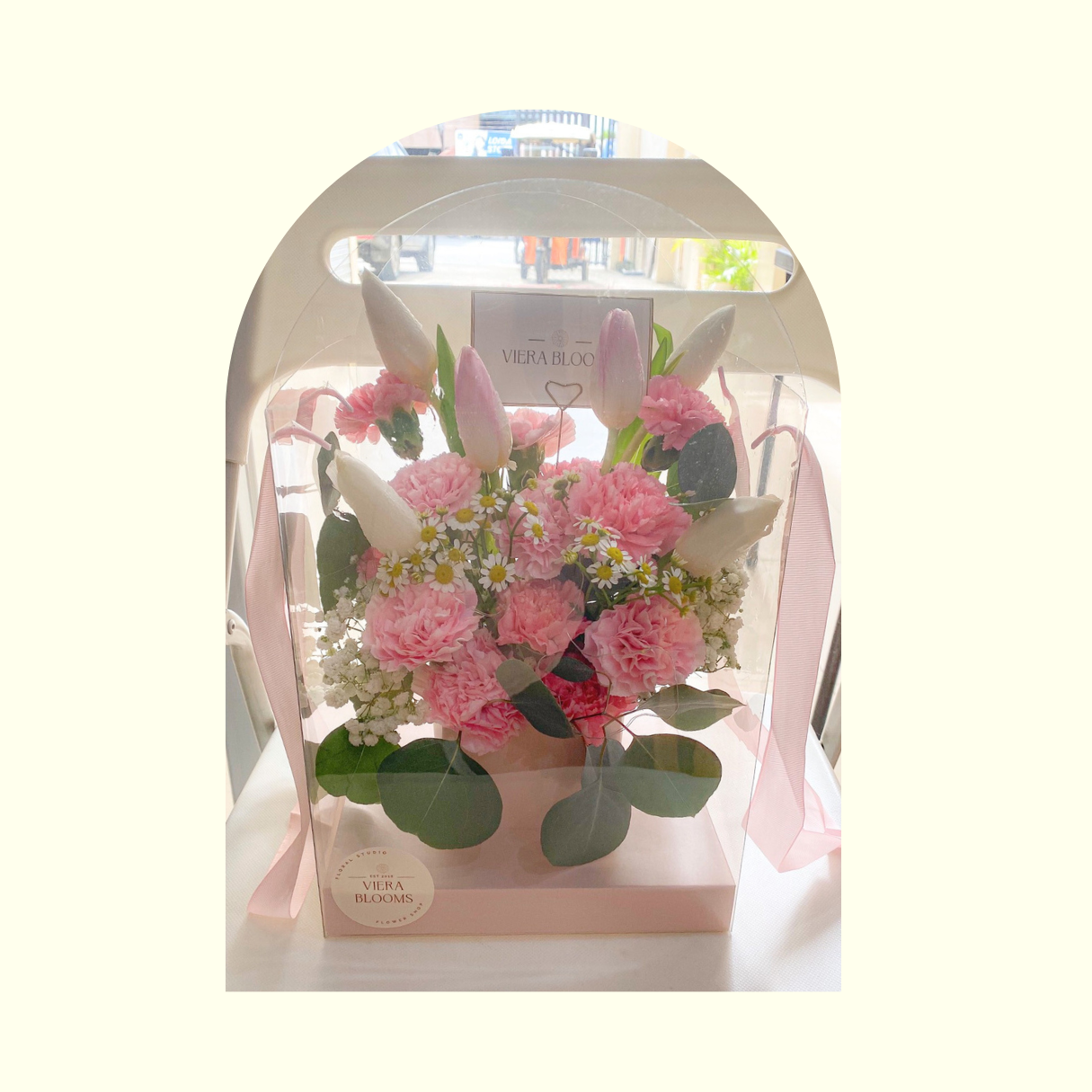 Fresh Flowers composed of 6 pcs light pink/white tulips and 12 pcs pink carnations with silver dollar leaves or eucalyptus, whichever is available, with gypso and/or chamomile fillers. Arranged in window gift bag flower box. .