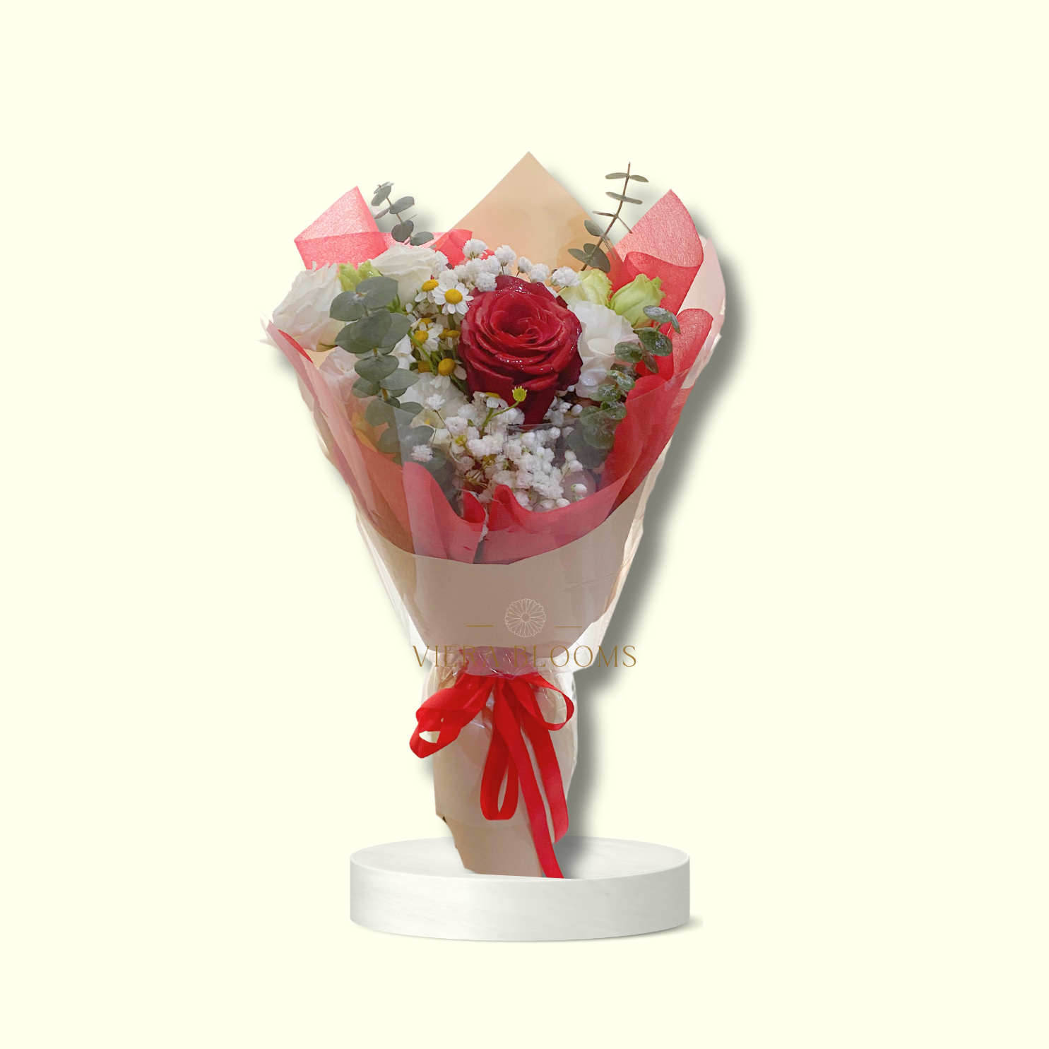 Single Red Rose with Gypso , Lisianthus and Eucalyptus Leaves. Fresh Blooms that can last upto 3-4 days with minimal proper care.